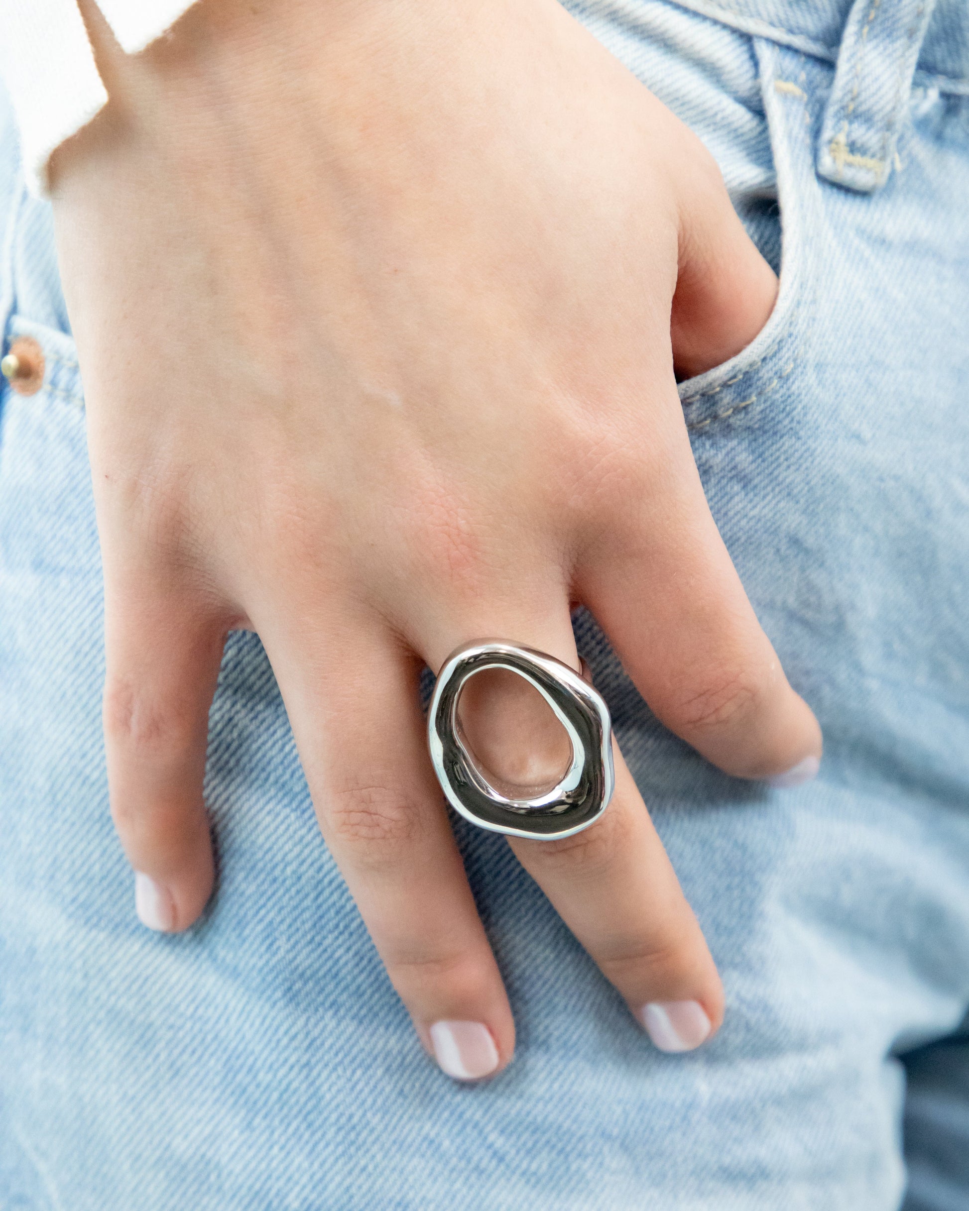 Stand out with this spectacular abstract and minimalist ring, ideal for those seeking a modern and sophisticated accessory. This ring is made of waterproof steel, and its organic, fluid shape adds a touch of art and elegance to any outfit. Its adjustable size makes it comfortable and versatile, perfect for wearing alone or layering with other large ring styles in our collection.