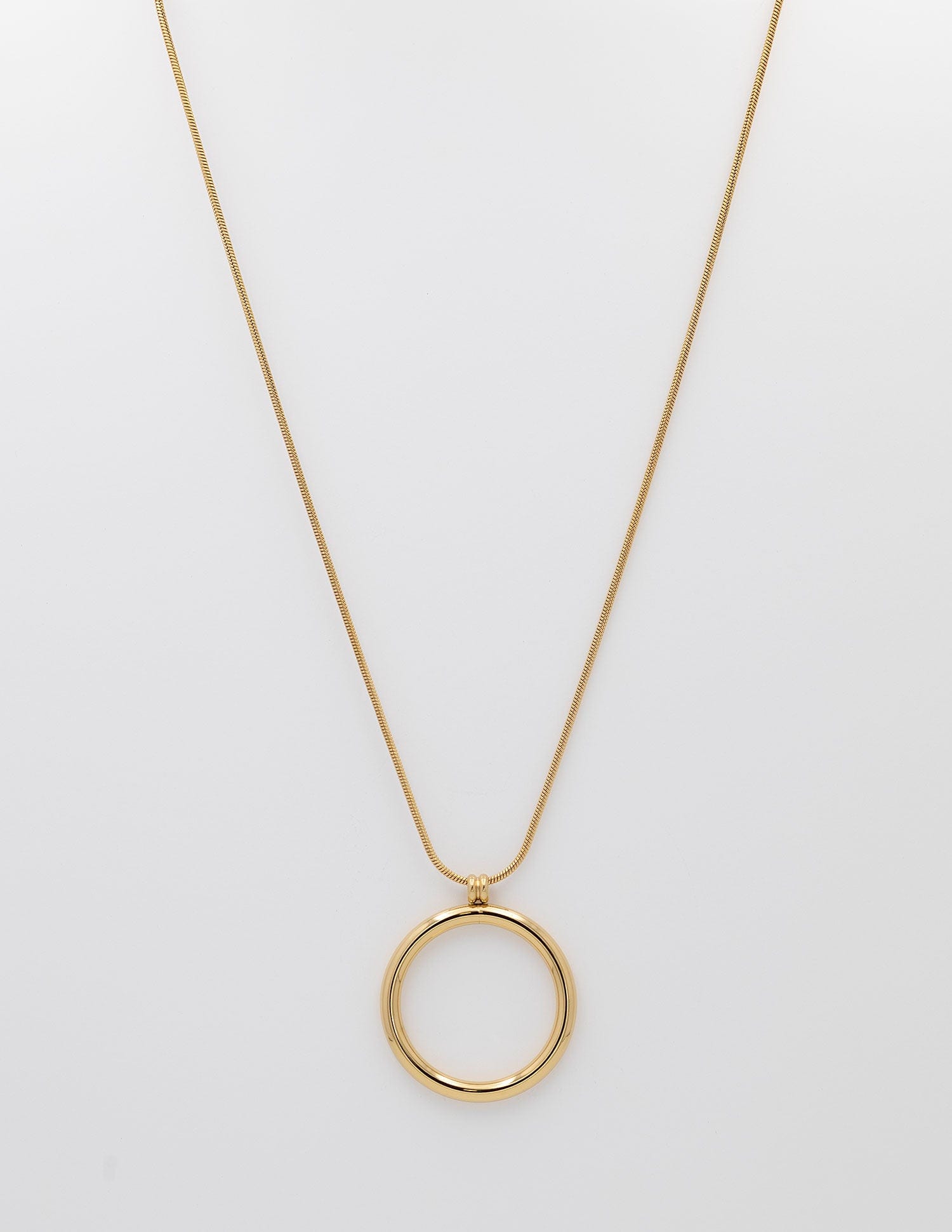 Collar con aro colgante central. Un diseño simple con mucha intención. El aro central simboliza unión y equilibrio , convirtiéndose en un accesorio que completa cualquier estilo. Este collar es de acero dorado waterproof y lleva una cadena estilo cordón serpiente.