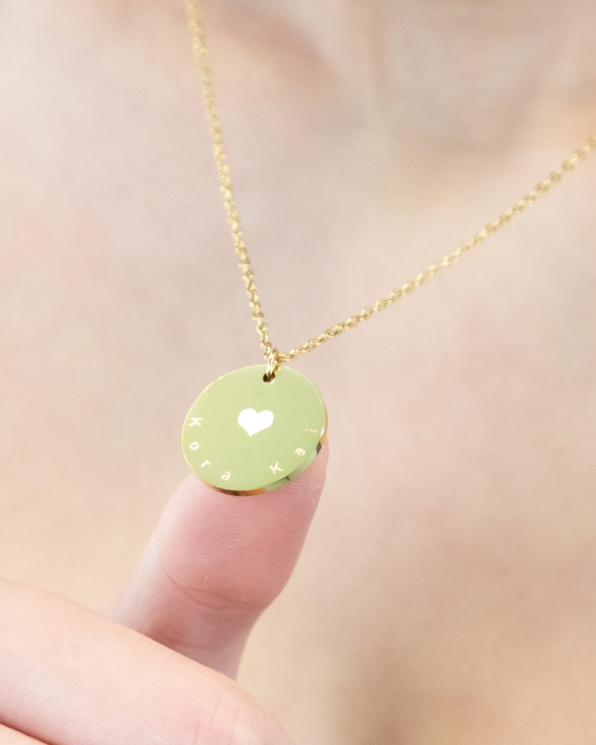 This personalized medallion is ideal for engraving a name, initial, date, or more. This model will always feature a filled-in heart in the center and whatever you specify below in a circular pattern, as seen in the example photo. You can wear it alone or combine it with other charms and/or necklaces. Available in gold-plated and silver-plated steel.