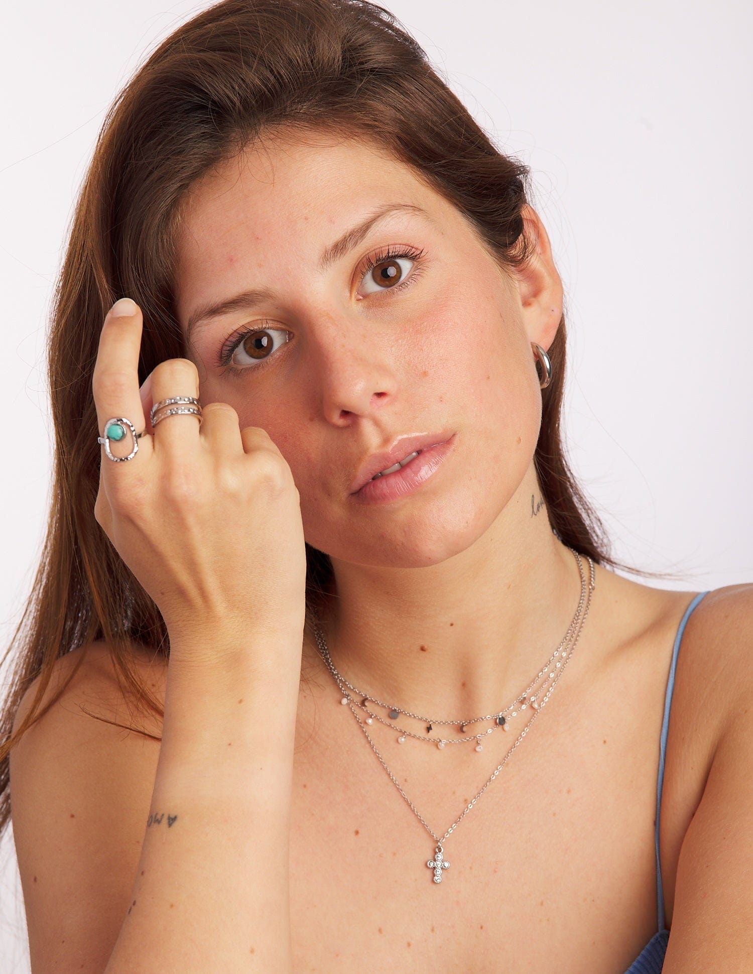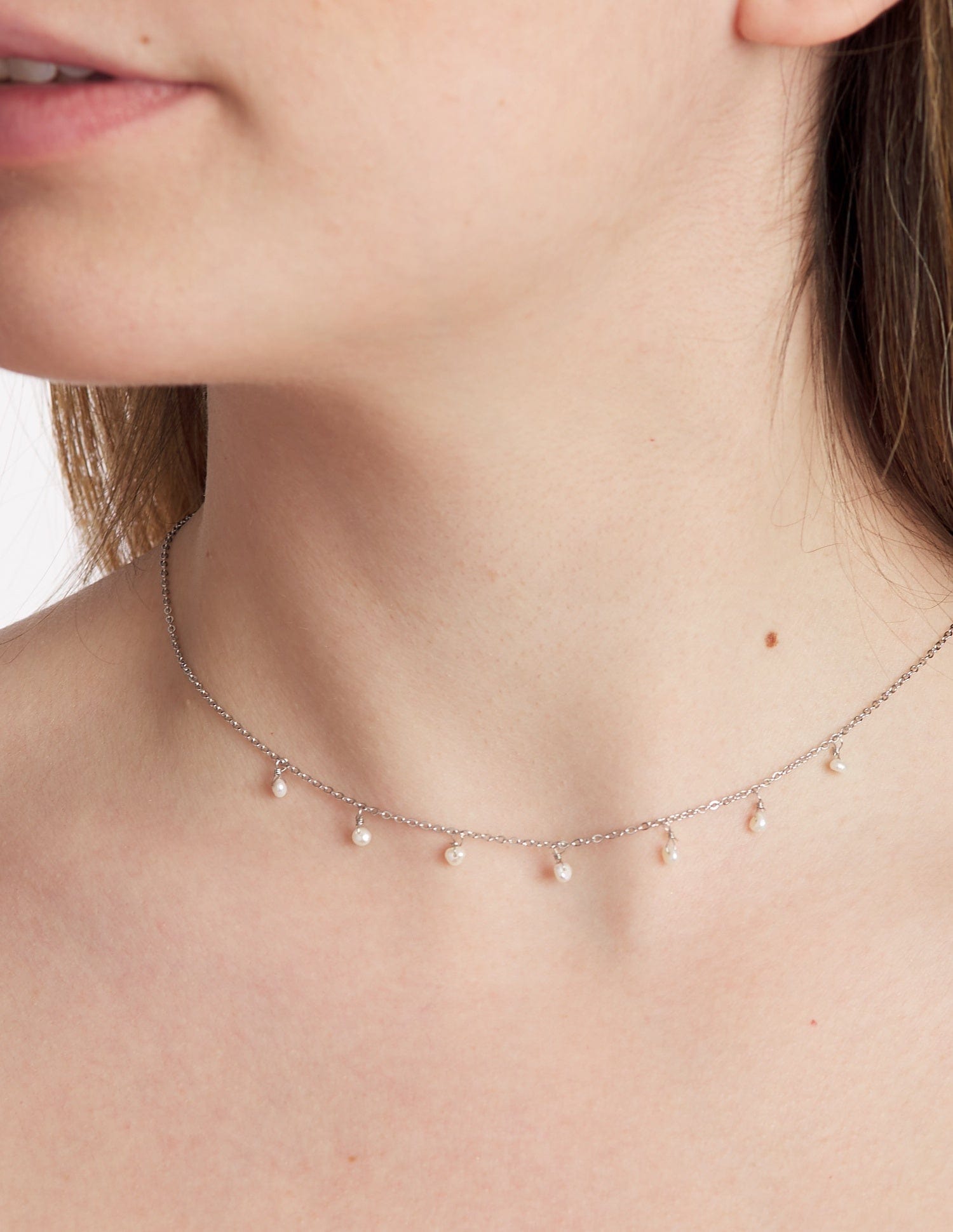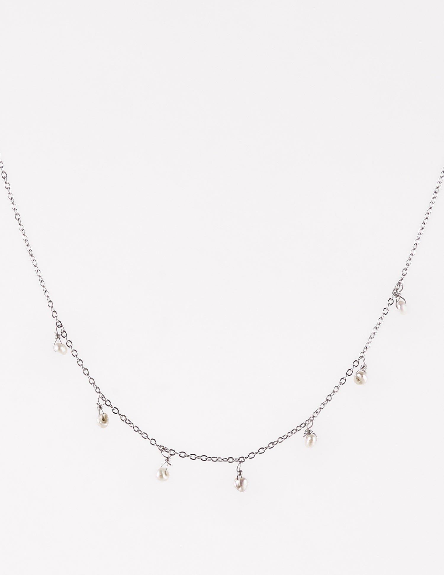 The Federica necklace is perfect for pearl lovers. These are cultured pearls. The necklace is made of stainless steel, so you can easily get it wet. Seven tiny pearls dangle from it, and it looks gorgeous on. Combine it with other necklaces from our collection; one of the photos gives you an idea!