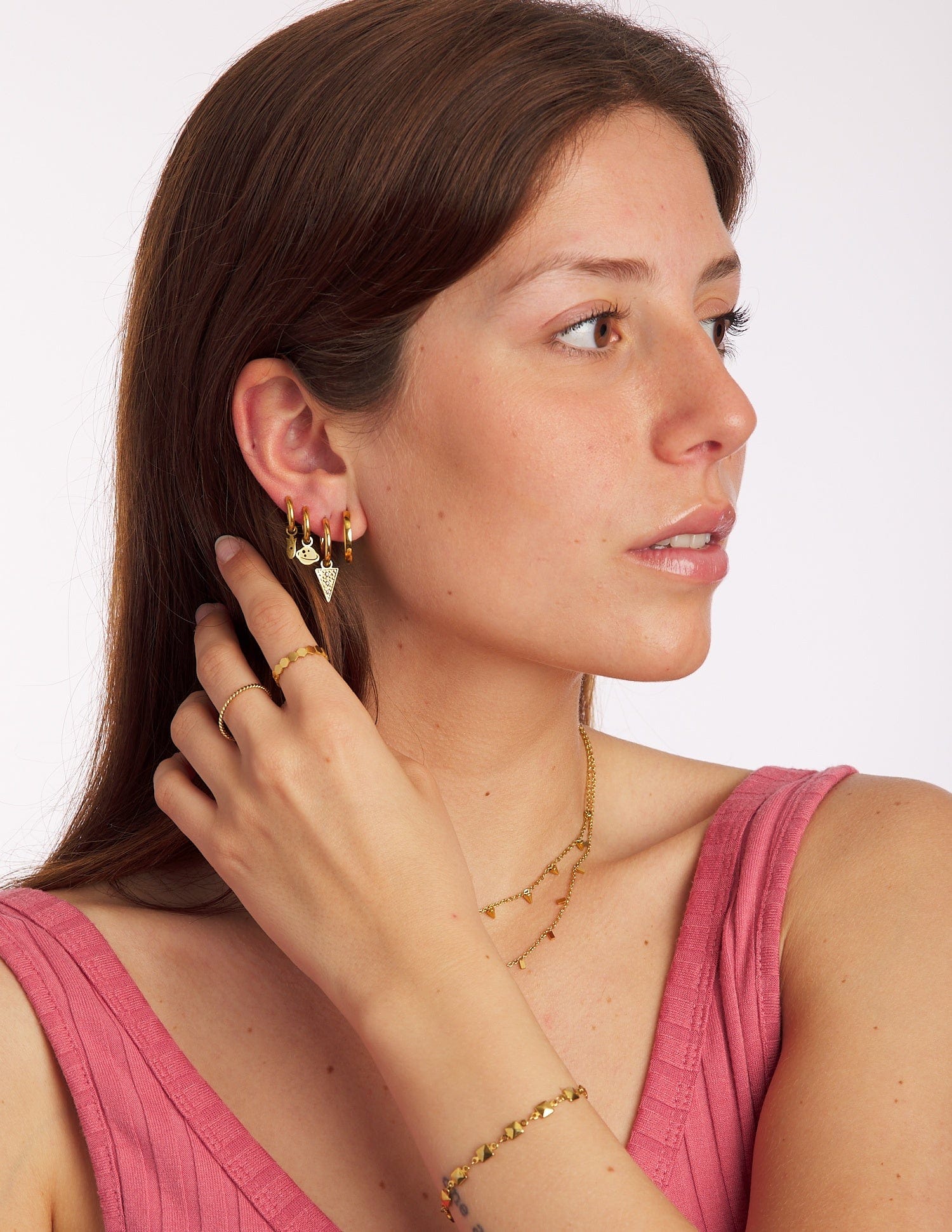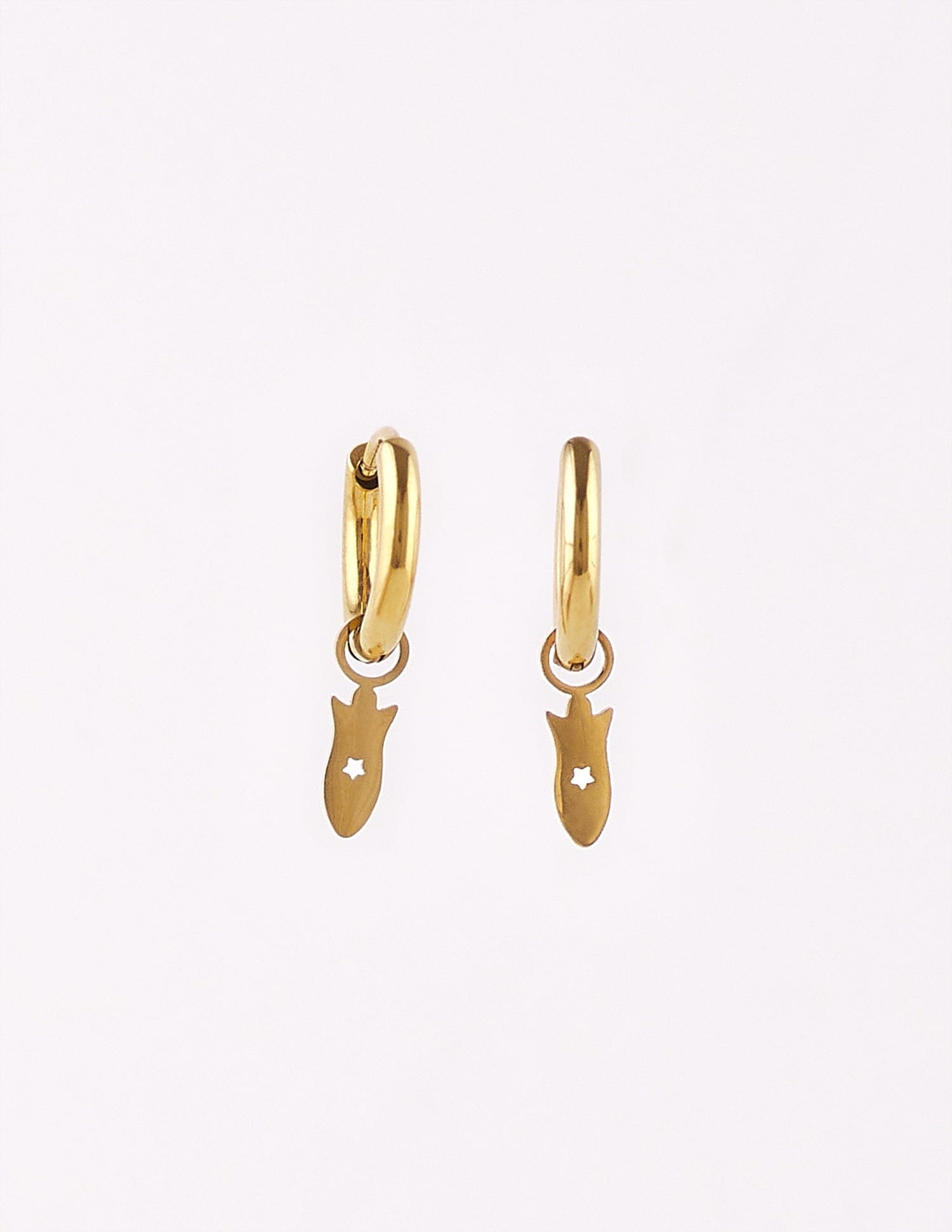 The Tamara earrings are made of gold-colored steel, and the best thing is that you get two earrings in one. Yes, you can remove the rocket, store it neatly, and use the hoop with a simple, smooth click closure.