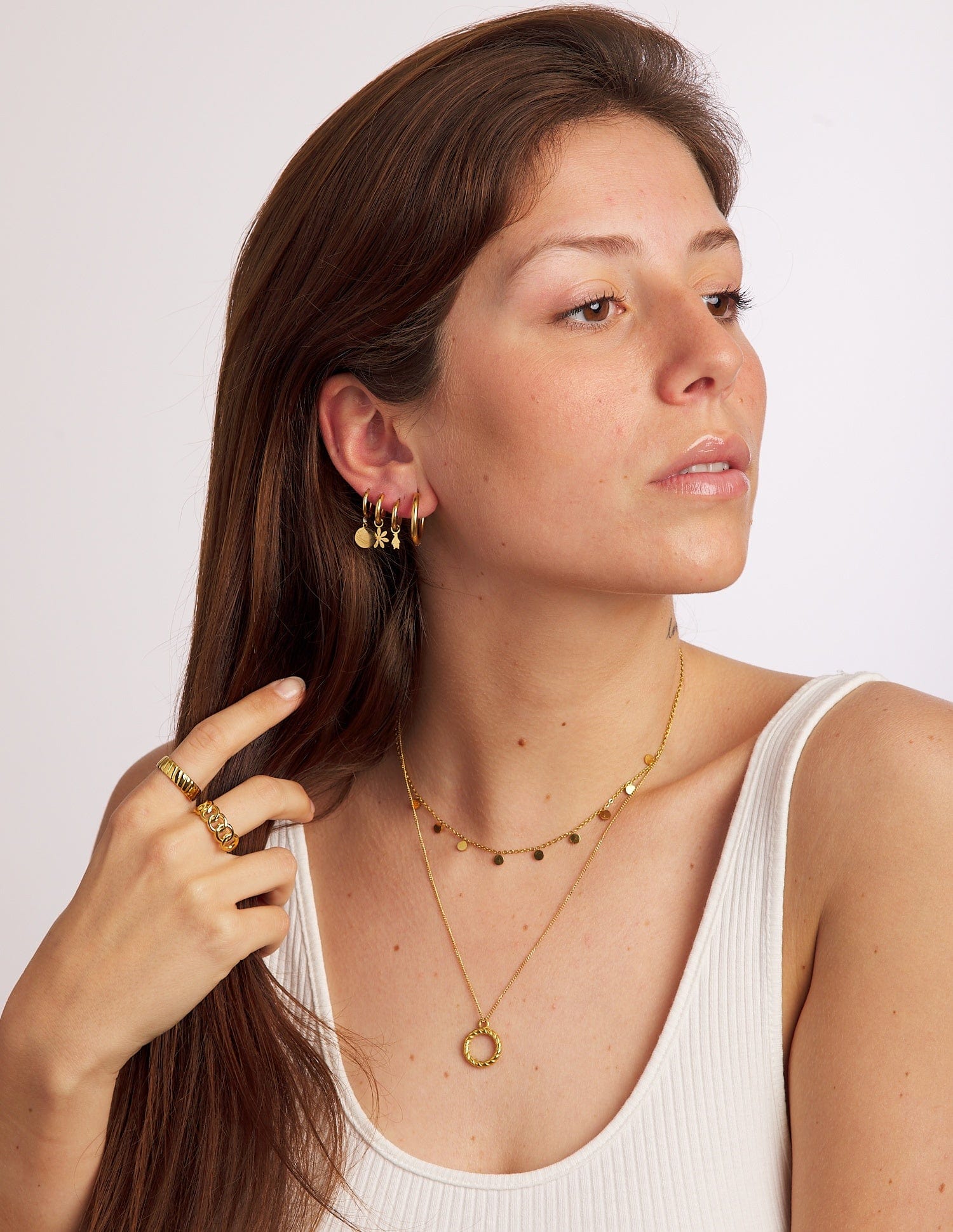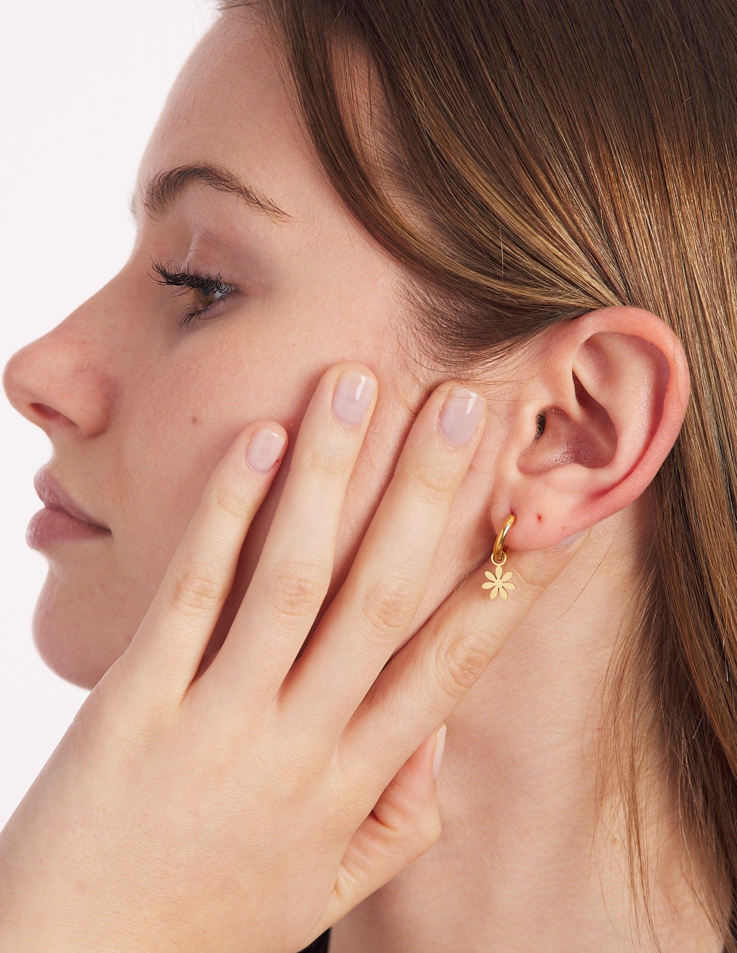 The Leyre flower-shaped earrings are super versatile when it comes to combining them if you have more piercings, but if not, you can wear them perfectly in your first ones. This model is made of gold-colored steel. The great thing about the Leyre earrings is that you can remove the flower charm whenever you want and wear the hoop with a simple, click-on closure. They're completely waterproof, so you can shower with them without any problems.