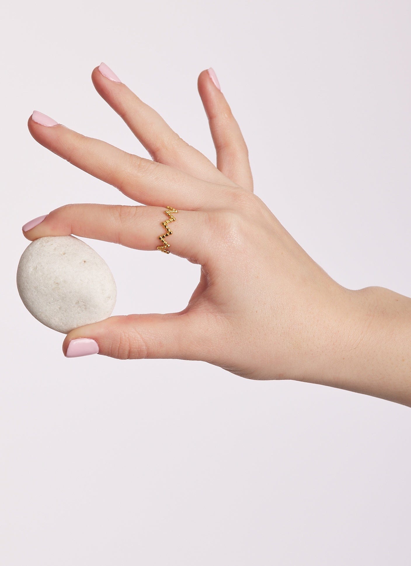 El anillo con forma zig-zag fino, se ajusta perfectamente a tu dedo, es elegante y versátil. Puedes mojarlo, por eso lo querrás usar todo el verano, y no quitártelo para nada.