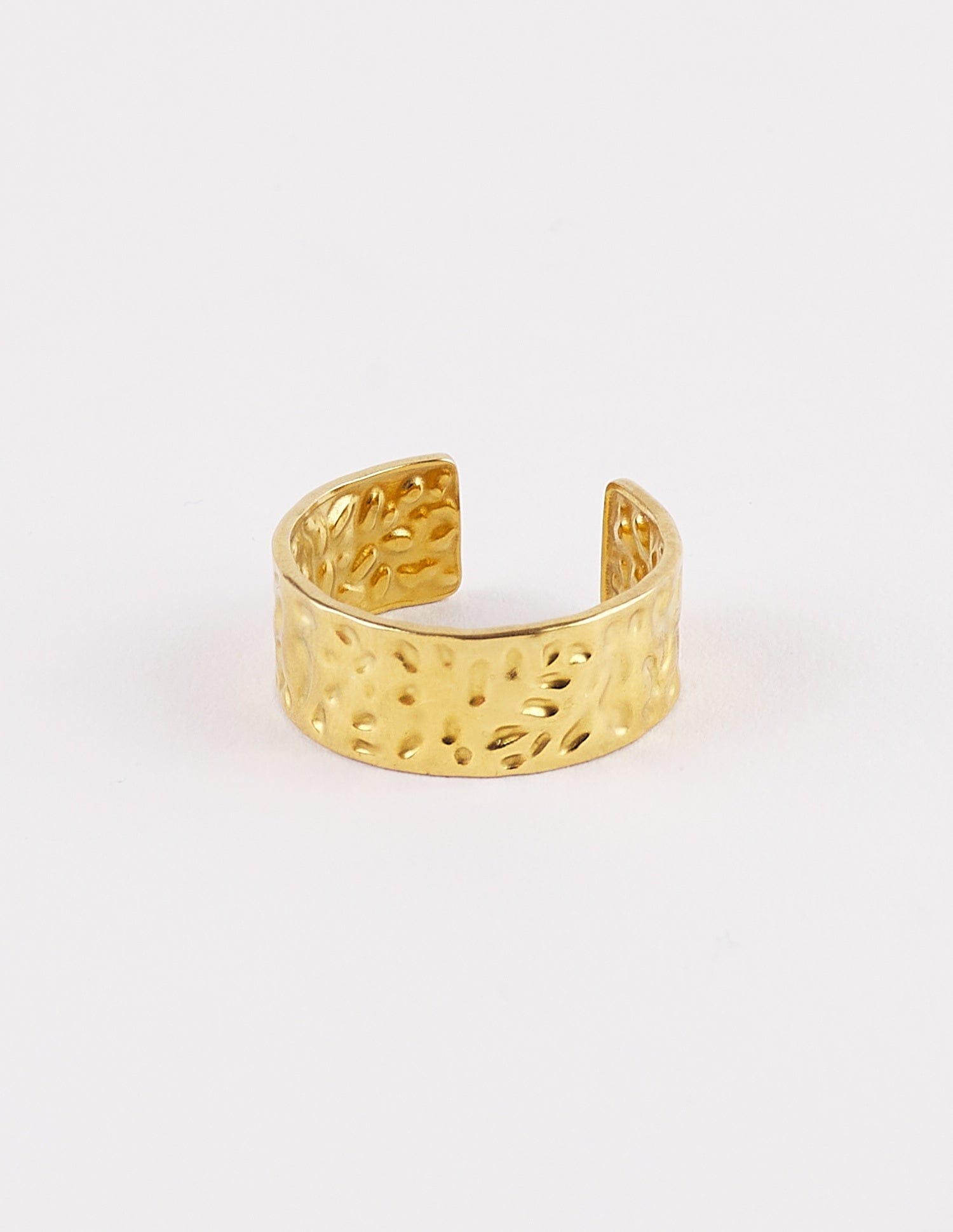 El anillo de acero dorado Ana tiene un diseño medio ancho con un poco de relieve.
