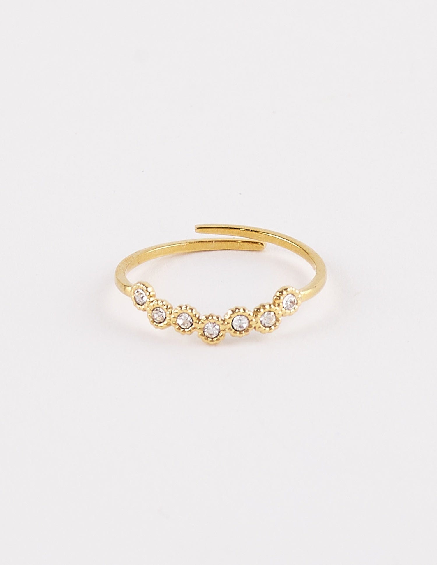 El anillo con brillantes Cindy es waterproof, tiene seis circonitas redondas que hacen una forma preciosa, y se ajusta a tu dedo perfectamente, es ideal para tus looks más discretos y sencillos, te encantará su finura y cómo brilla. El anillo Cindy lo puedes combinar con el que quieras de nuestra colección