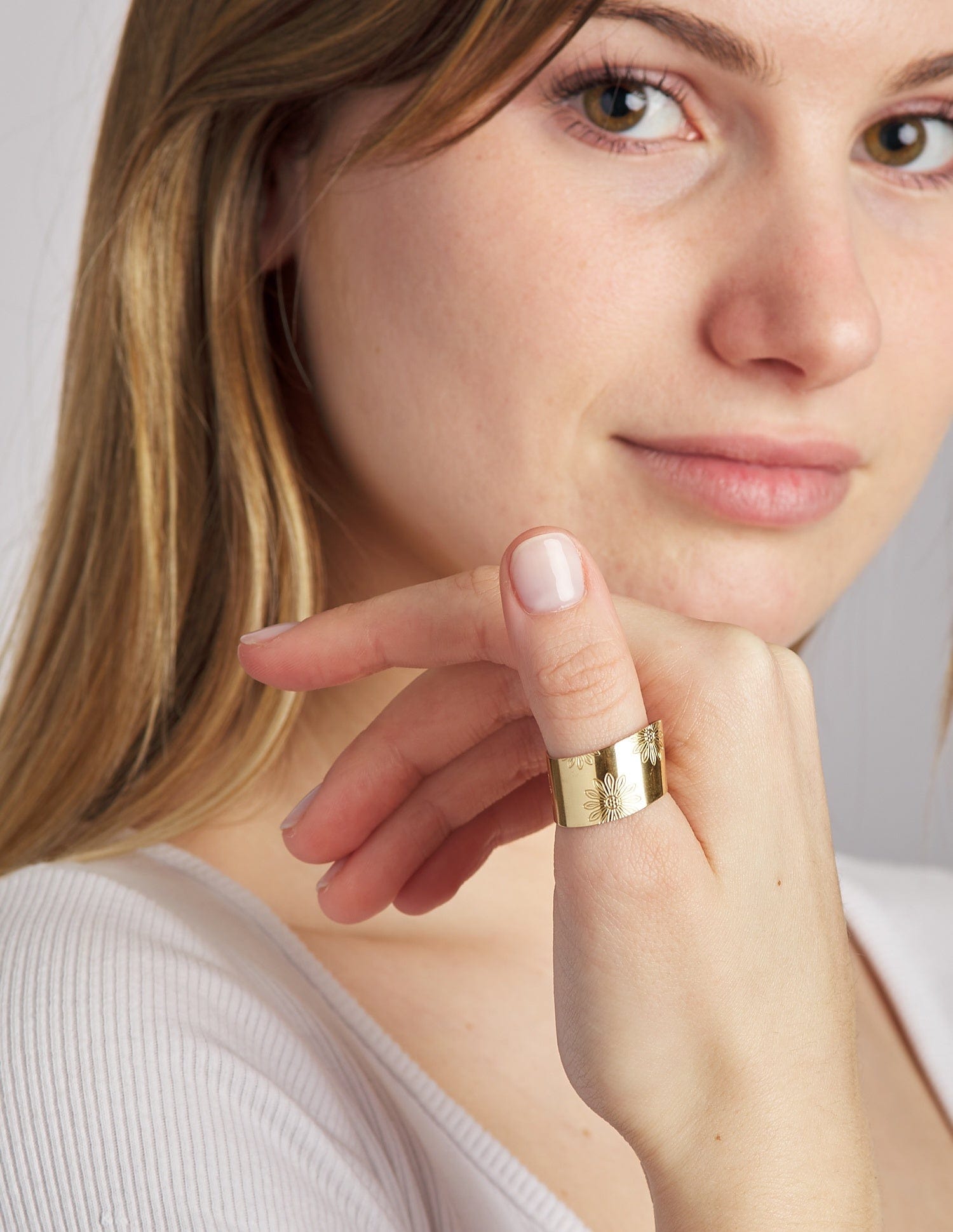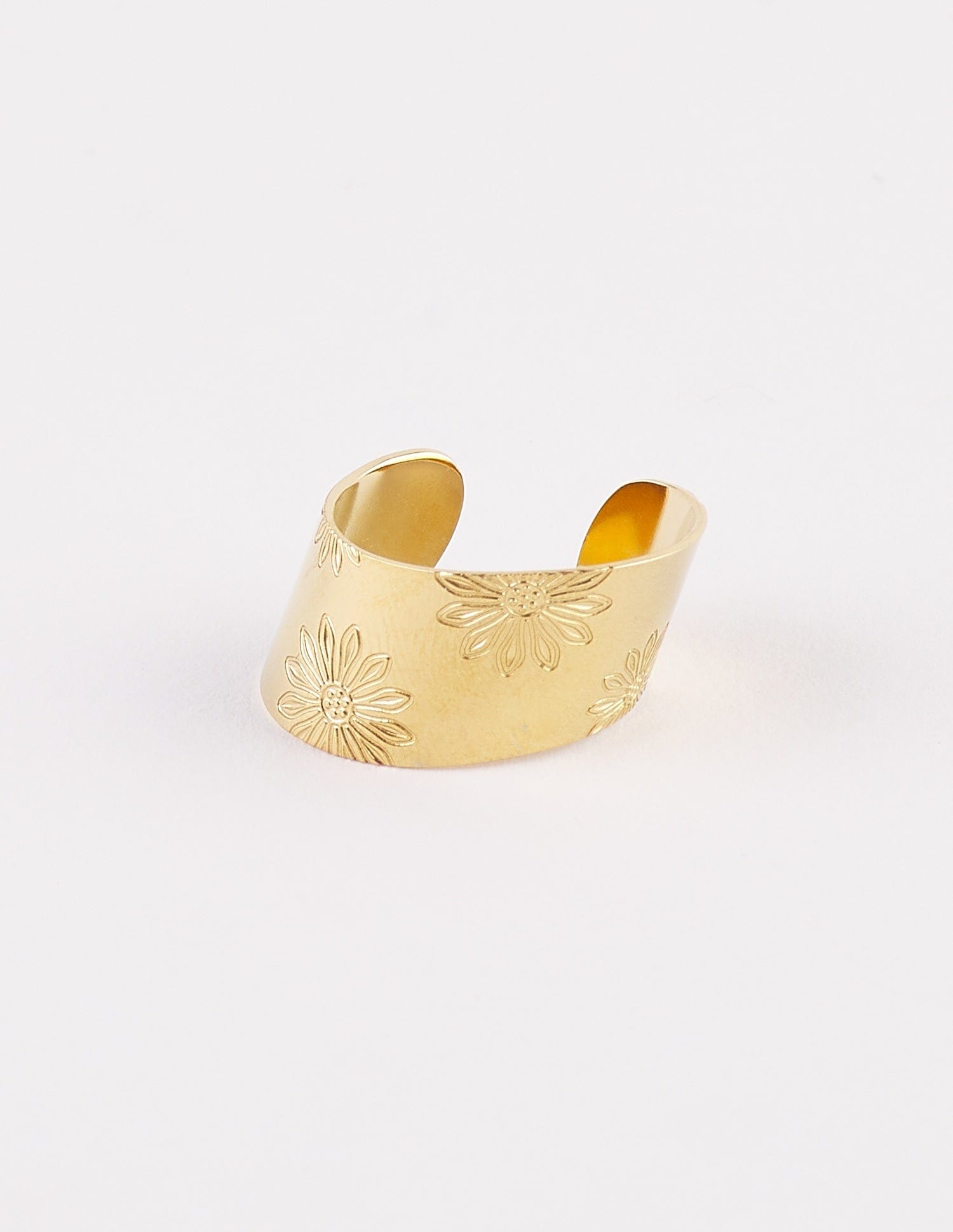 El anillo Alba es atrevido e original de color dorado es especial y es un anillo atrevido por su forma en diagonal y su precioso grabado de flores.