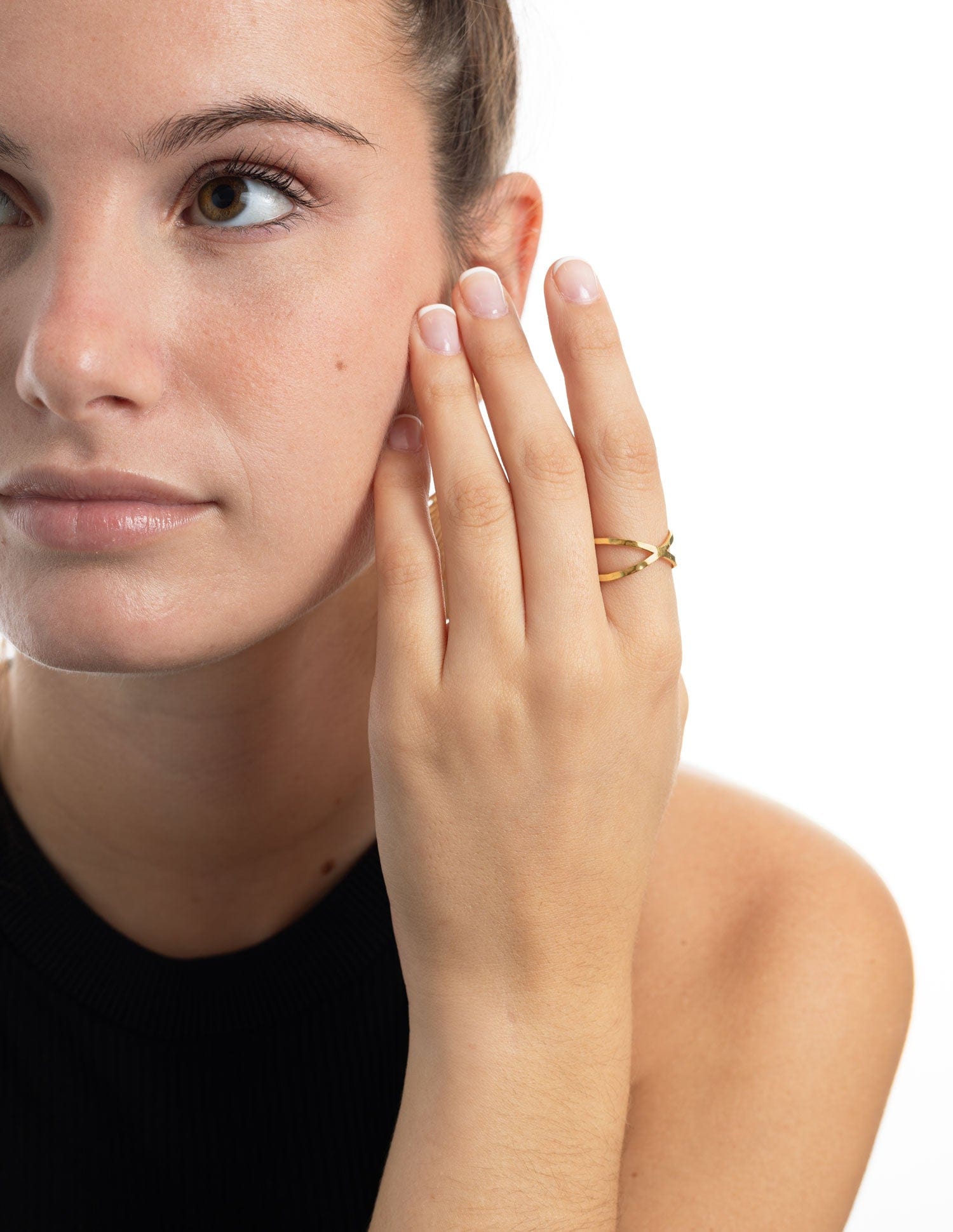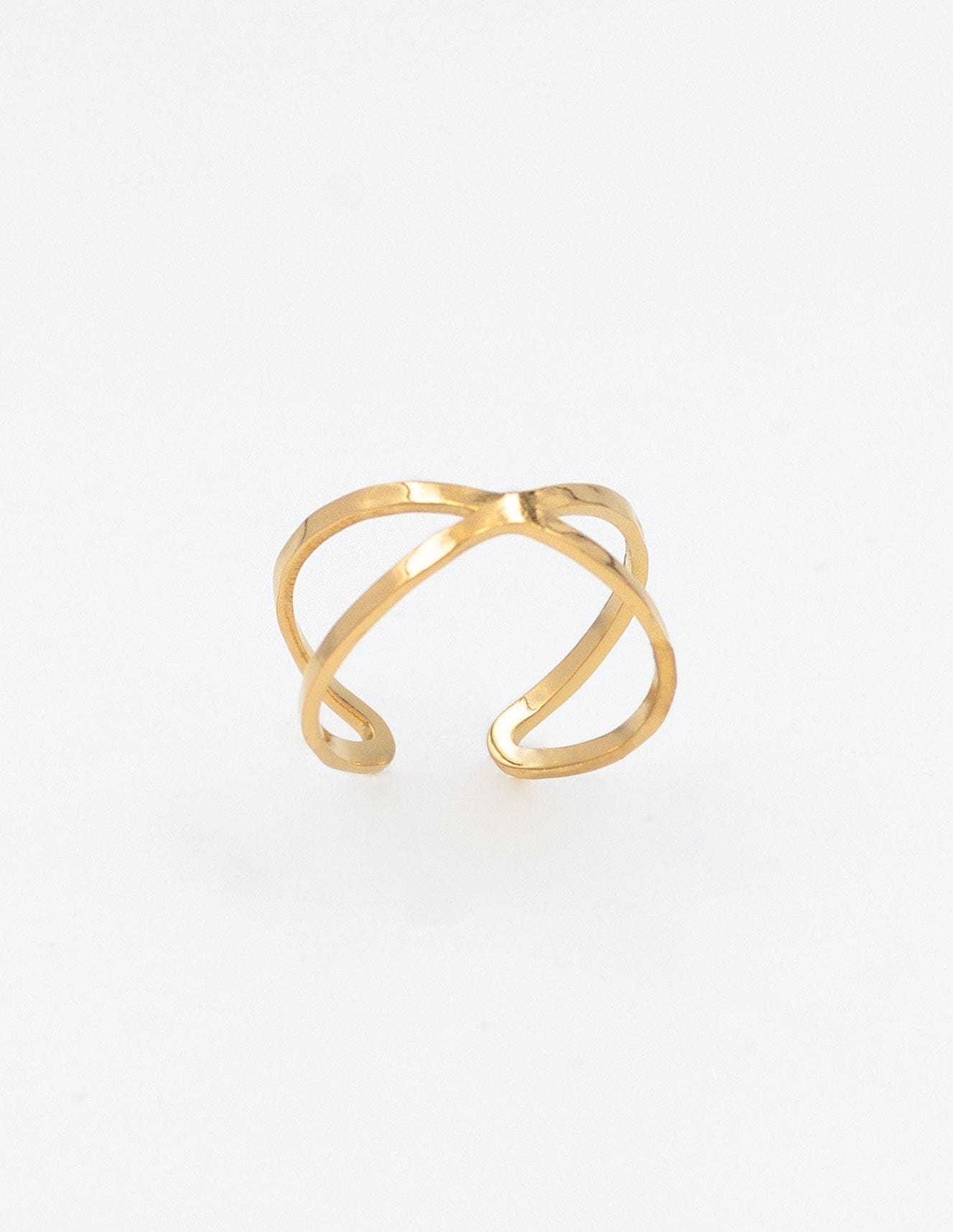 El anillo cruzado dorado Freya es un anillo cruzado y fino a la vez. Se ajusta perfectamente, podrás llevarlo siempre y mojarlo tantas veces como quieras. Es ideal para regalar, no falla. Lo hemos combinado con el anillo Albertina