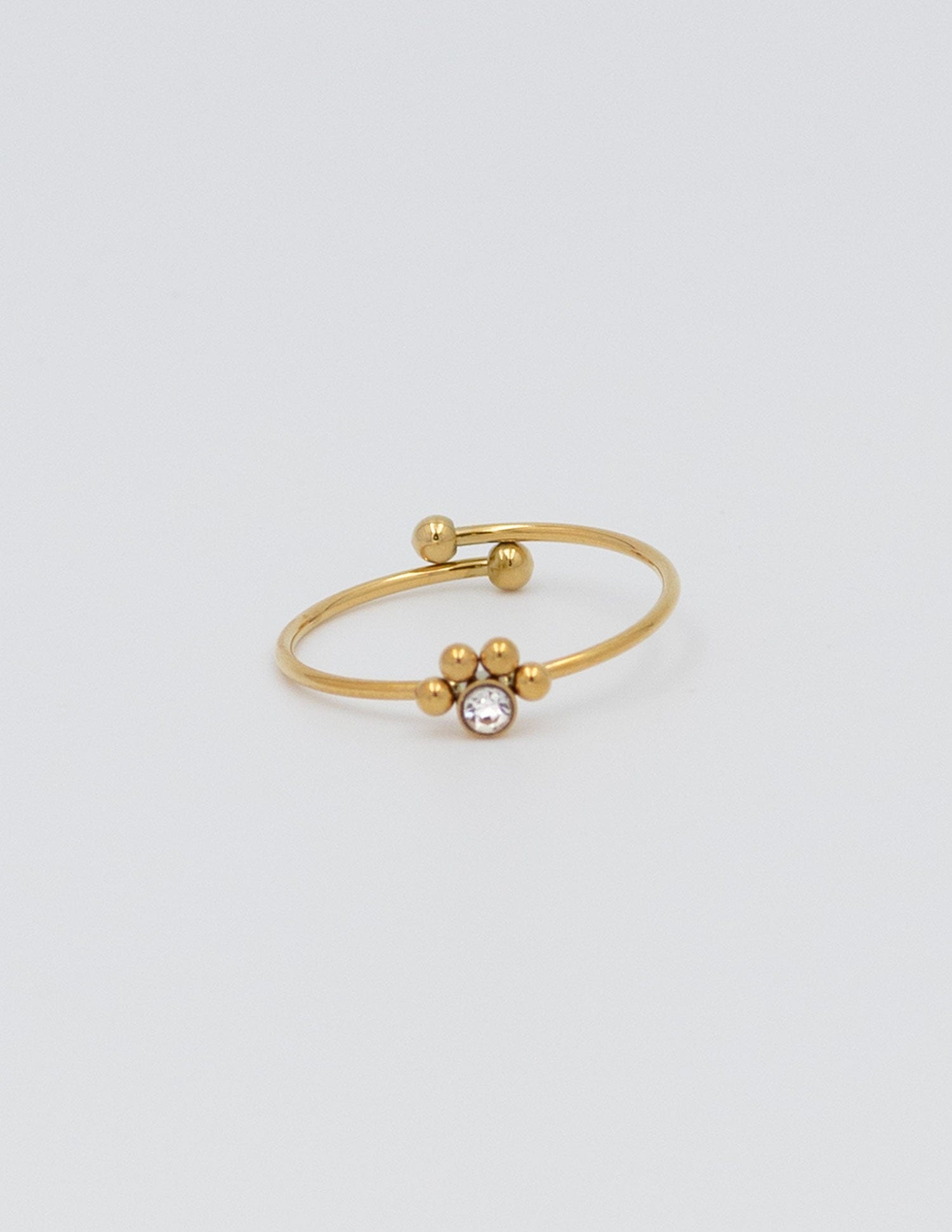 Un diseño fino y atemporal que combina sencillez con un toque de brillo. Este anillo de acero inoxidable dorado presenta una circonita pequeña central realzada con pequeños detalles en forma de bolitas. Perfecto para usar solo o combinar con otros anillos minimalistas.