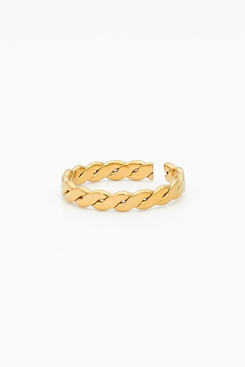El anillo fino trenzado Fleur destaca por su diseño elegante en forma de cadena trenzada, delicado y sofisticado, ideal para llevar a diari o en ocasions especials. Su acabado dorado aporta un toc de llum i feminitat a la teva mà, mentre que la seva estructura fina el fa perfecte per combinar amb altres anells o lluir-lo en solitari.