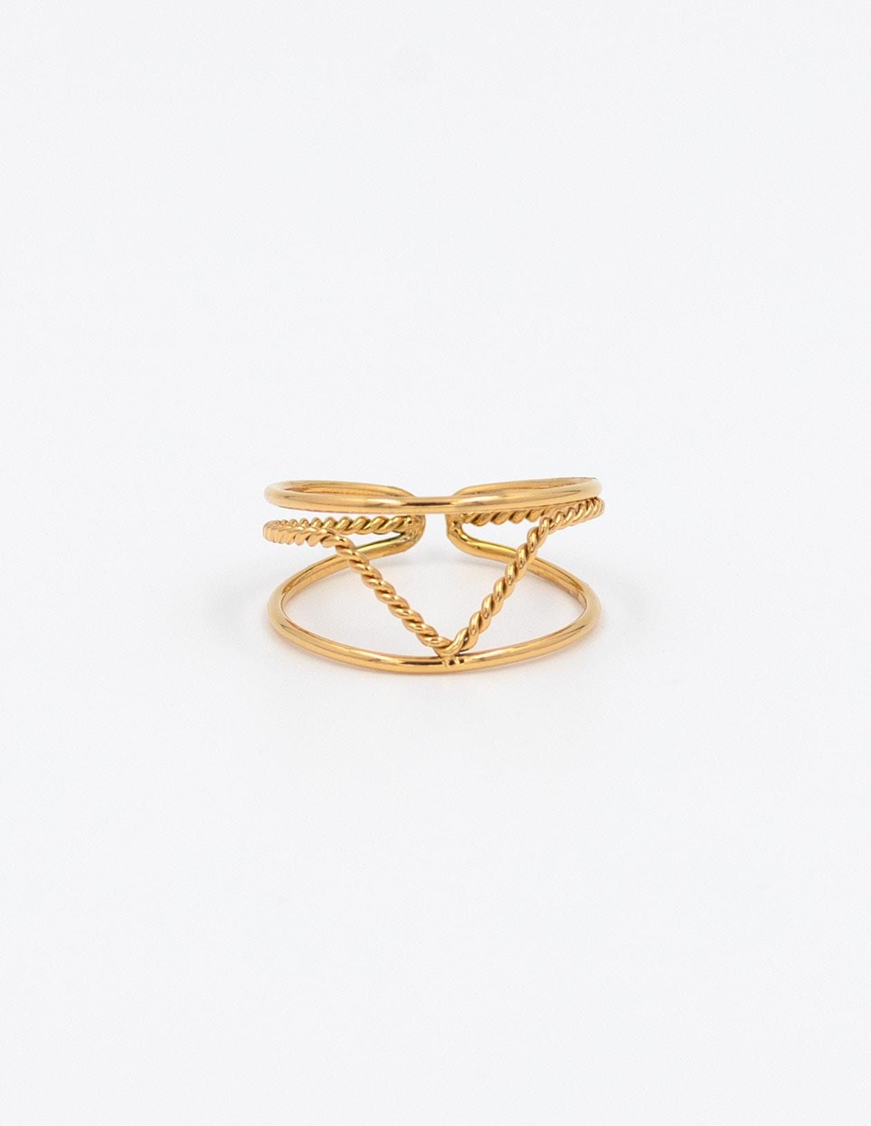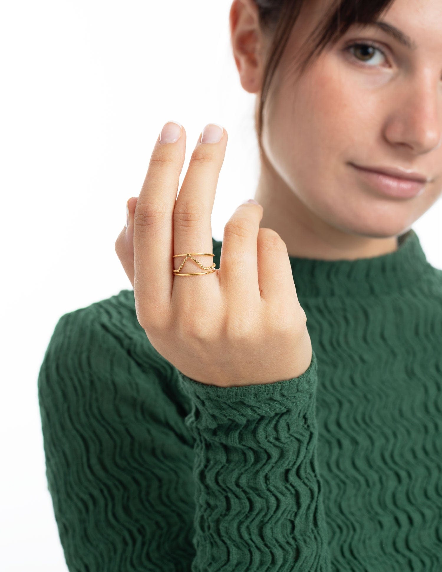 Domenica es un anillo especial dorado, con forma doble y con un toque de trenzado en medio. El anillo Domenica es waterproof y ajustable como todos los de nuestra colección. Te enseñamos en la fotos con cuáles lo hemos combinado.