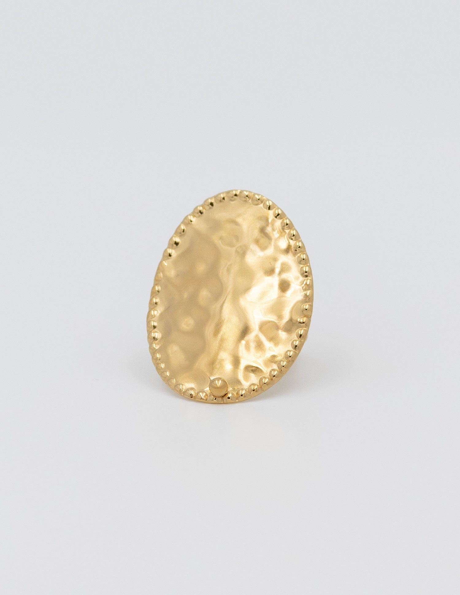 Anillo de acero inoxidable, estilo medallón grande ovalado con una textura rugosa y con detalle en el borde. Un diseño minimalista para tus looks más especiales.
