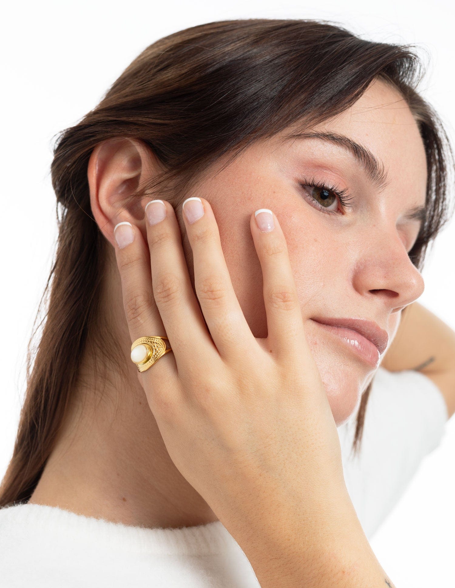 El anillo con piedra luna Anabella es tan bonito con esa peculiar piedra ovalada que hace que el anillo sea más especial. Puedes combinarlo como hicimos nosotras con el anillo alexandrina. Te preguntarán siempre por él, verás! Puedes mojarlo sin problema, pero igualmente te invitamos a leer en nuestro apartado de Cuidado de las joyas, cómo conservarlas .