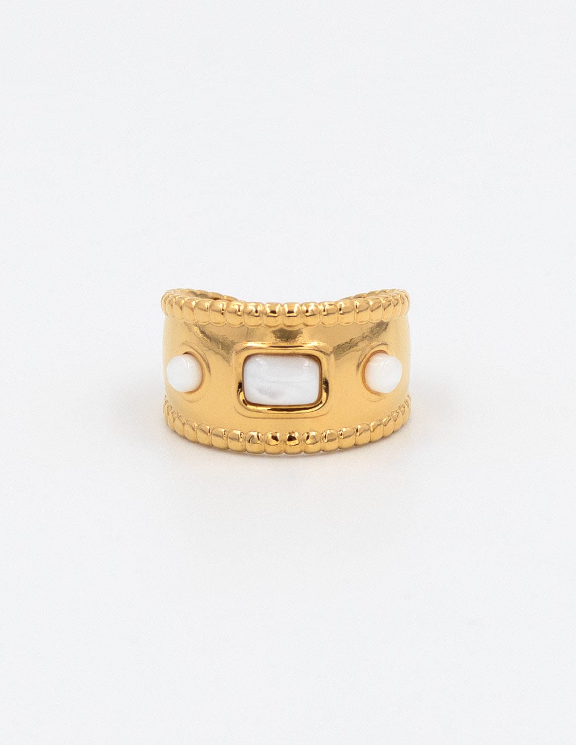 El anillo Telma consta de 3 piedras lunas pequeñas que hace que sea un anillo único y precioso, llévalo con tus mejores outfits en cualquier época del año, queda muy bonito combinado con el anillo Gia.