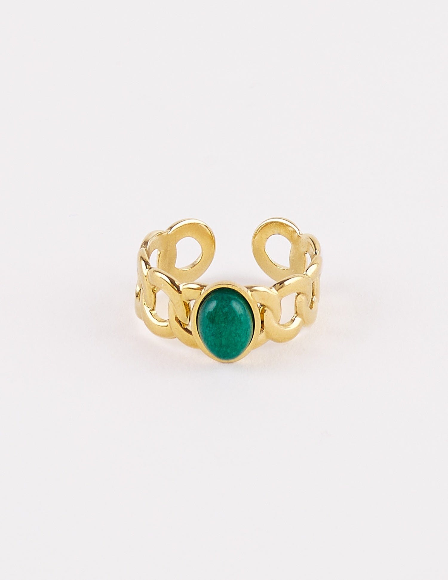 El anillo con piedra verde Clara tiene esa peculiar piedra ovalada verde central y continúa el anillo de eslabones a su al rededor.