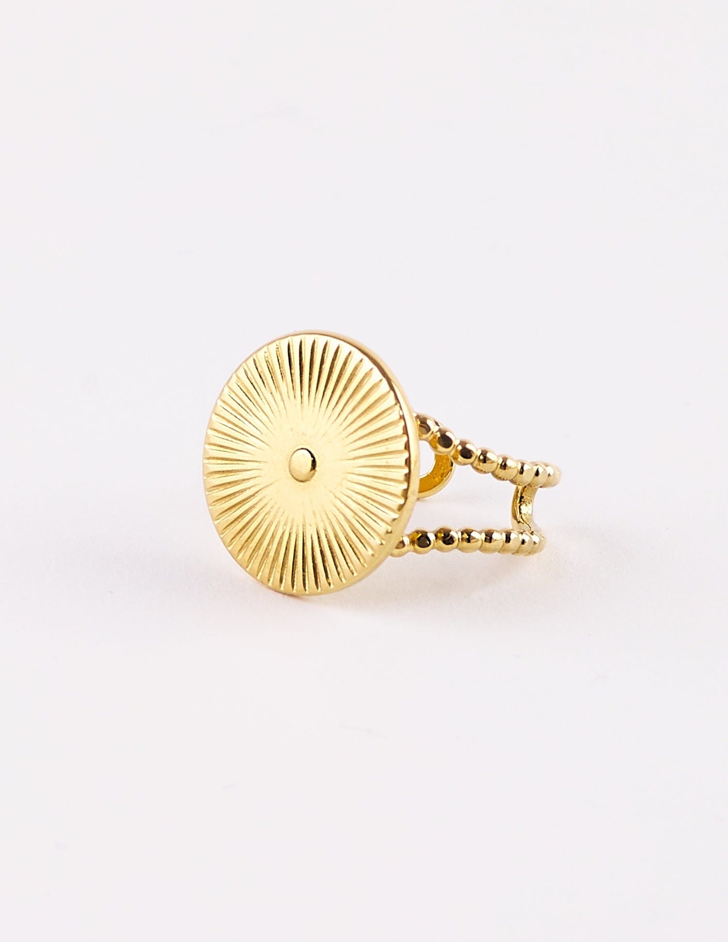 Su diseño es como anillo doble y en el centro un círculo con rayitas que recuerdan al sol.