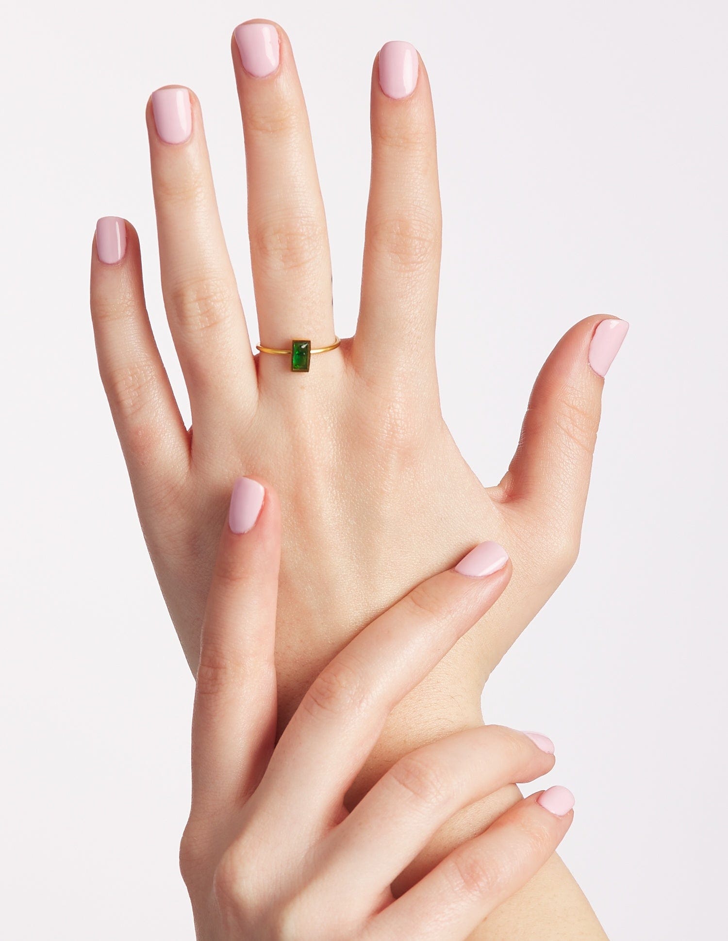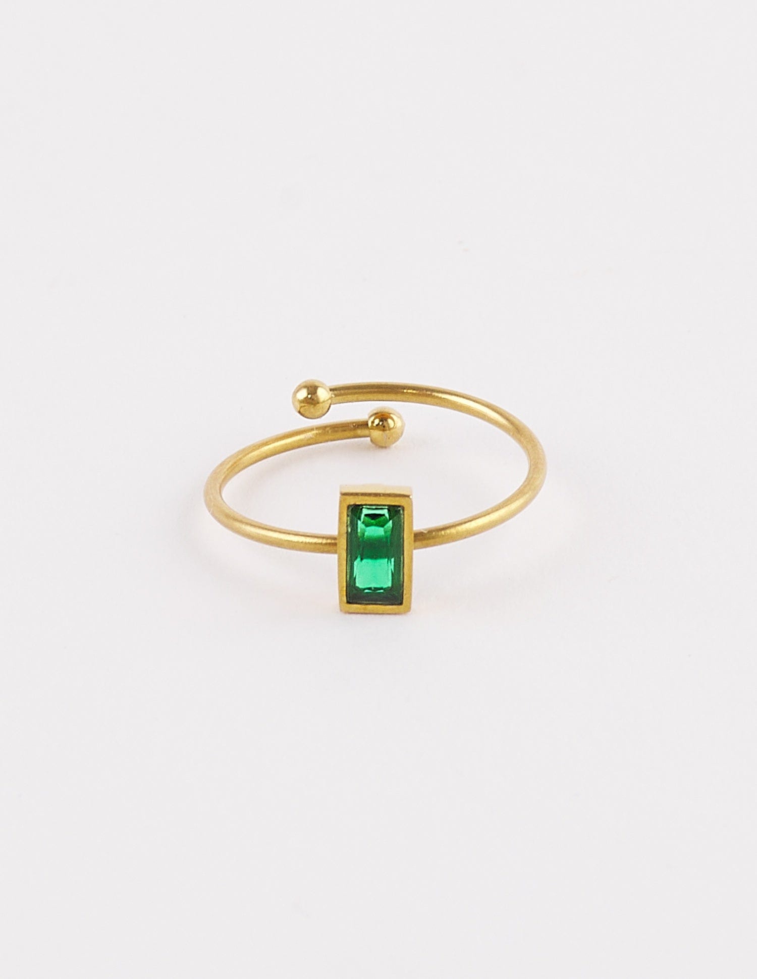 El anillo verde Neu, tiene como protagonista esa circonita color verde que combina perfecto con el dorado, hace que sea un anillo atemporal por eso quedará súper con tus outfits diarios de cualquier temporada. También está disponible con circonita blanca, se llama Eira .