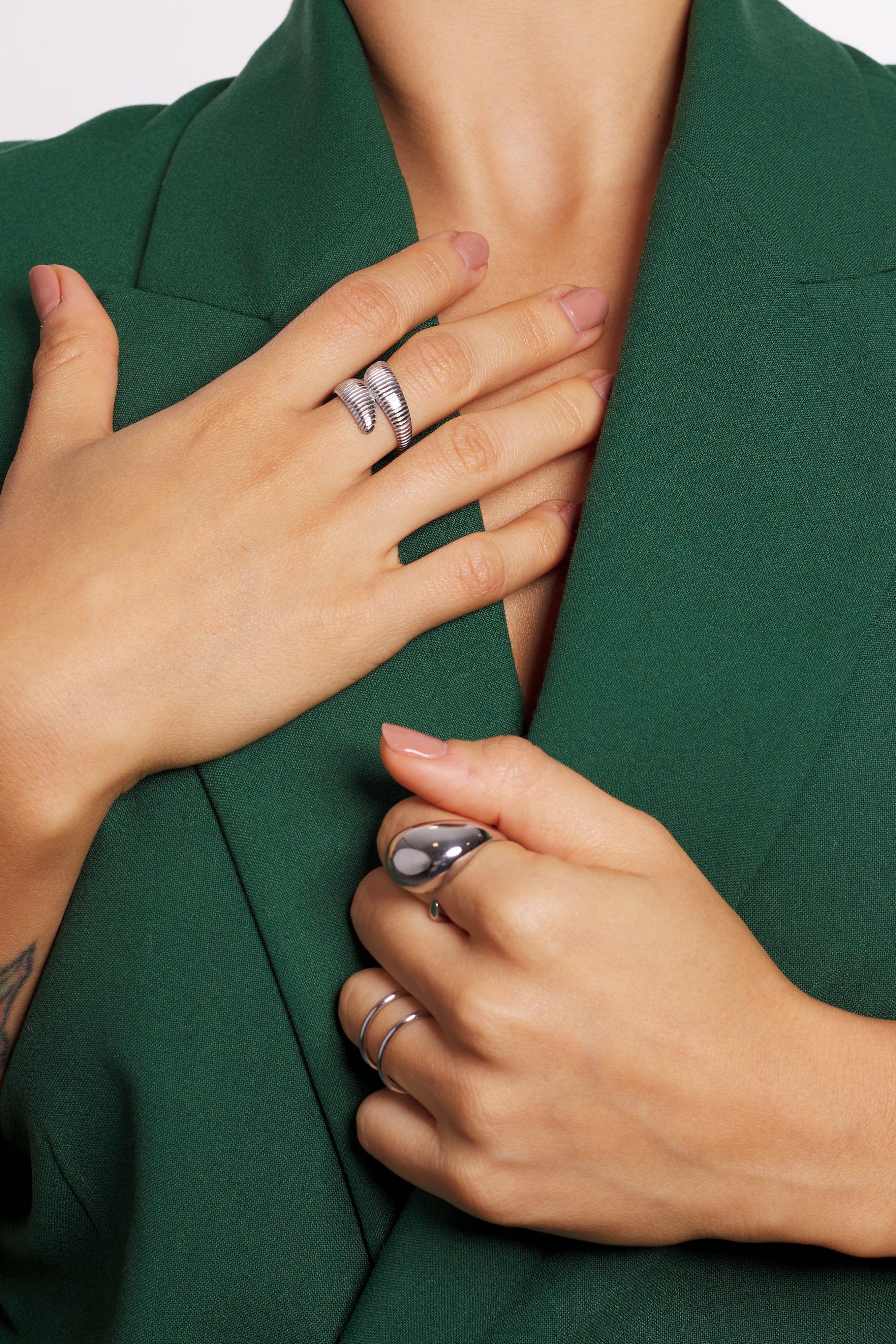 El anillo Harmonie es un anillo doble ajustable por detrás, con un dibujo rallado de acero inoxidable, plateado y resistente al agua. Combínalo con tus mejores looks.