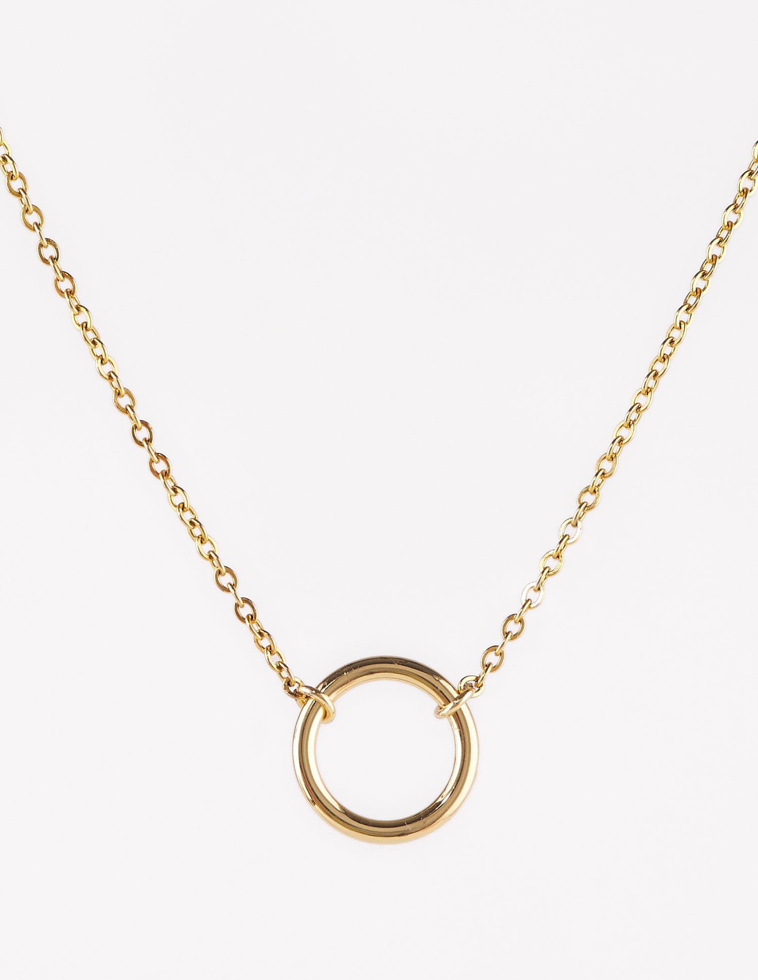 El collar con argolla dorado Anabel es muy elegante. Su cadena de acero color oro es un poco más gruesita y el contorno del círculo es liso y sin relieve. La combinación de la cadenita con el círculo queda genial!