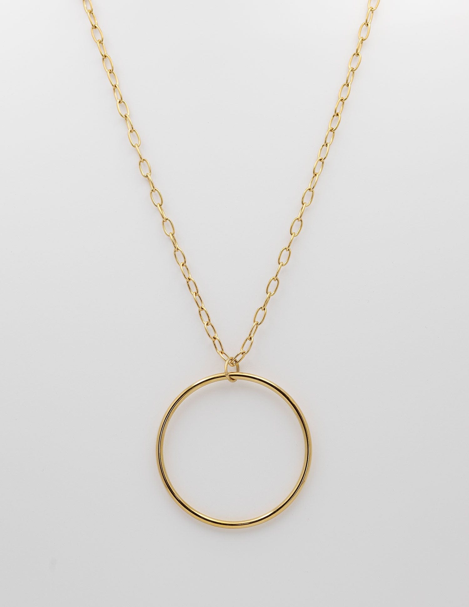 Collar de aro grande dorado de acero. Un diseño potente que no pasa desapercibido. El aro grande es símbolo de ciclos de continuidad, un detalle que habla de autenticidad y confianza en uno mismo. Un Best Seller, para ti o para regalar, acertarás seguro. Este collar con aro llévalo con tus mejores looks de fiesta, graduación o con el estilo más casual.