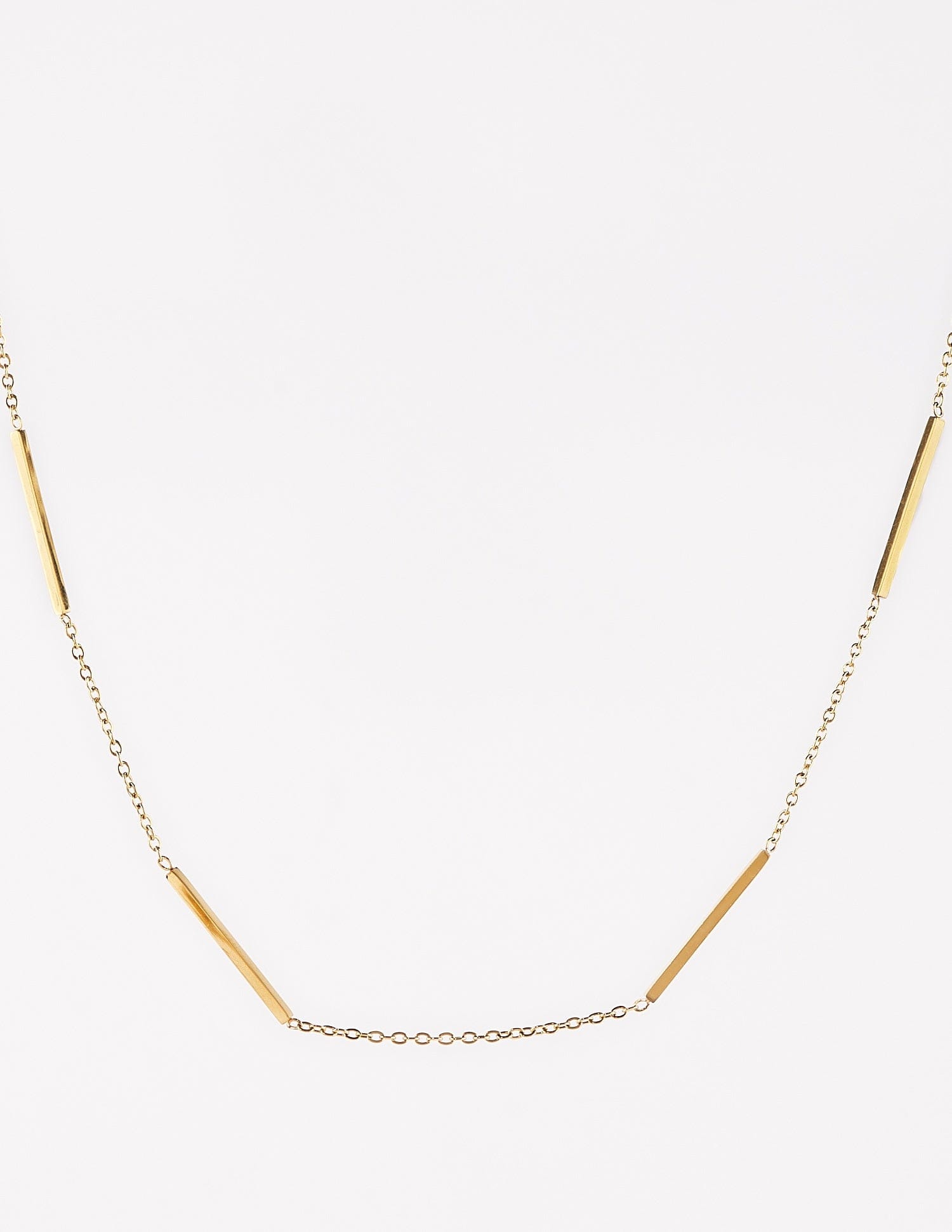 El collar fino con barritas Tania es un collar muy sencillo, es dorado con una cadena finita y una especie de cuatro barritas lisas dejando una separación entre sí. Esta joyita es muy finita y elegante, combinable con varios collares de nuestra colección.
