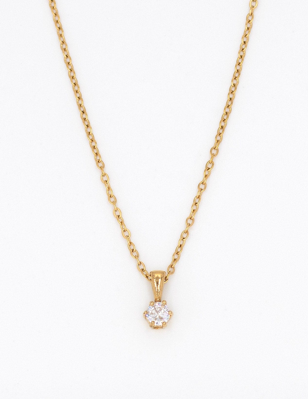 El collar dorado con brillantes Vanna es un básico precioso para ti o como opción para regalar, no falla! De ella cuelga una circonita redonda engarzada que hace de esta una cadena especial. Puede mojarlo sin problema y combinarlo o no.