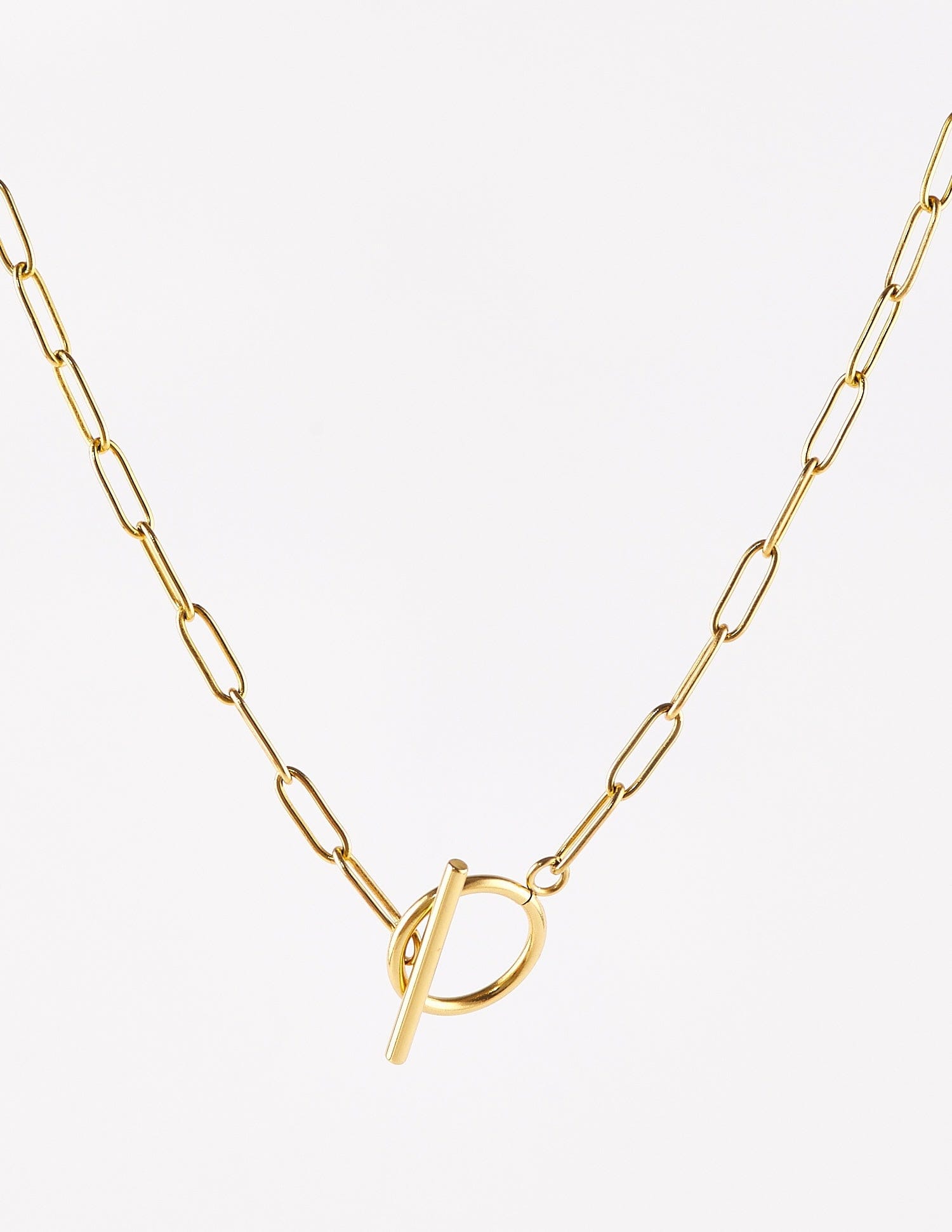 Este diseño de collar su cierre es por delante, pasando el palito por la argolla y queda súper original y precioso. Es de acero color oro , resistente al agua.