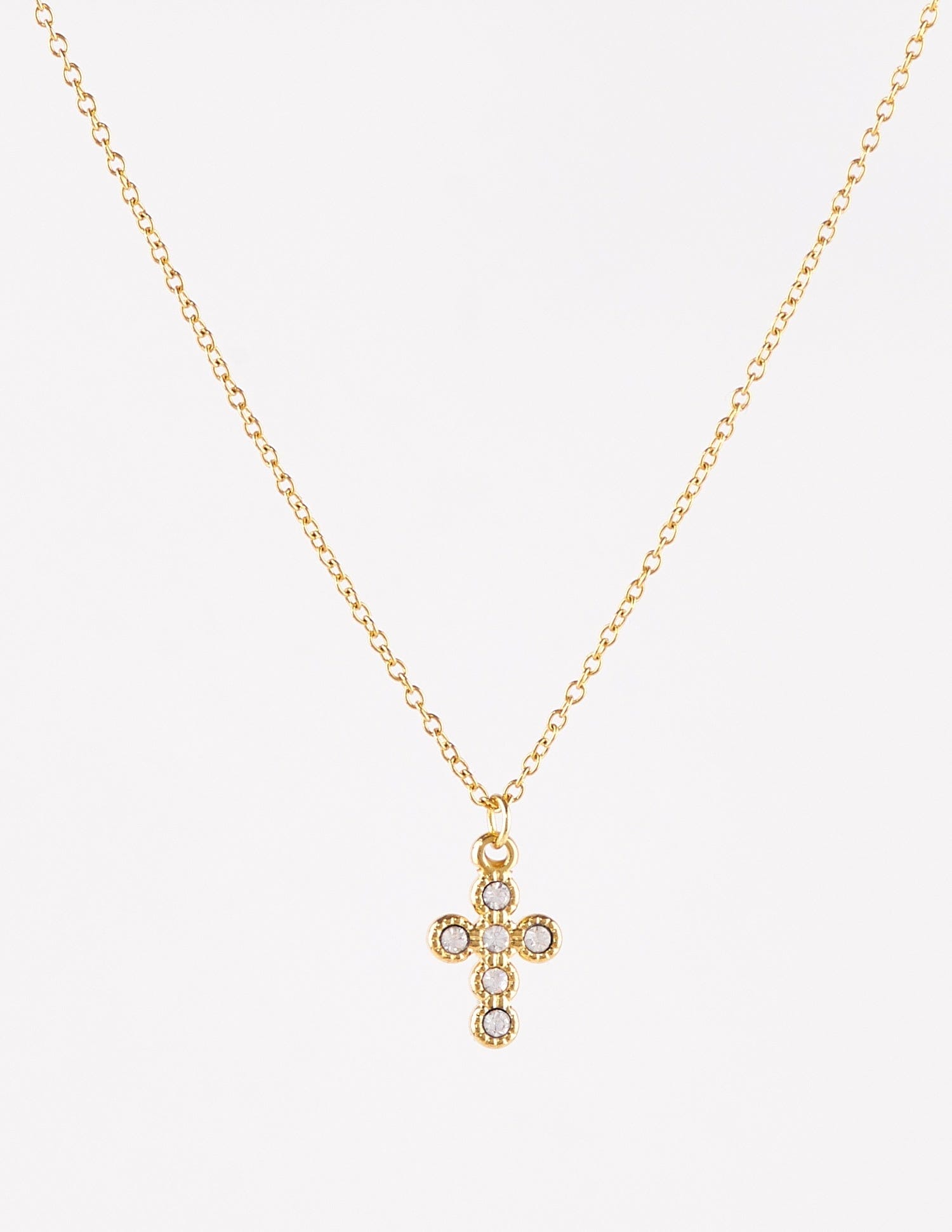 El collar con una cruz con brillantes con formas redondas, se llama Beth y tiene un diseño súper fino, y adorable para aquellas que les encanta llevar cruces siempre. Esta cadenita podrías usarla siempre y no quitártela para nada, es de acero por eso puedes mojarla en la ducha o sumergirla en verano vayas donde vayas. También lo tenemos disponible en plateado, Dolors.