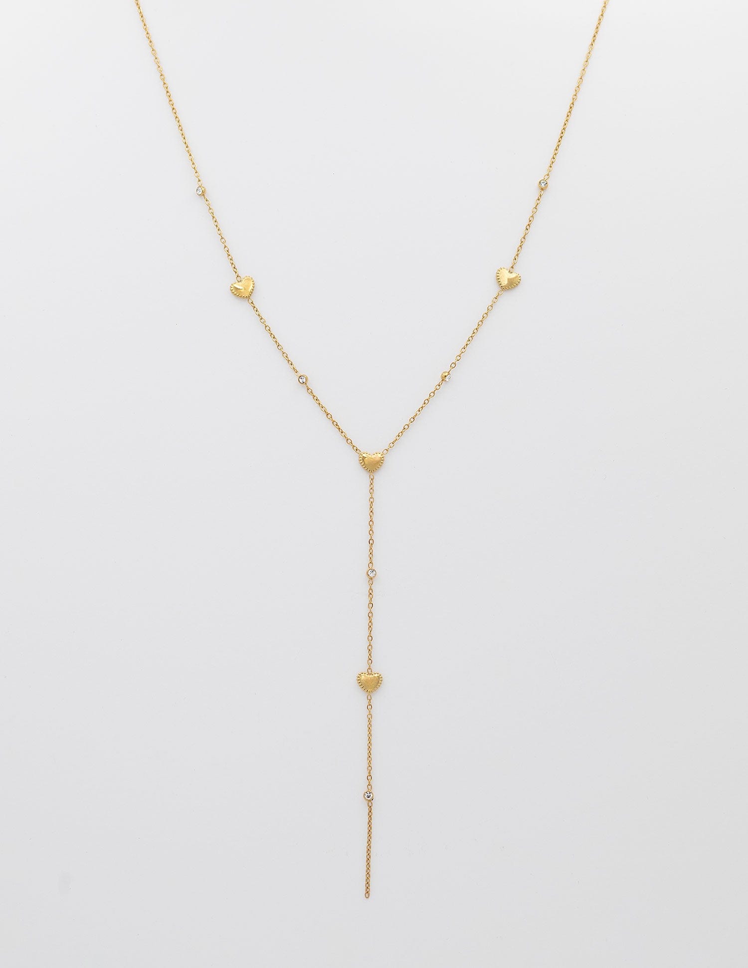 collar fino con cadena que baja al escote de acero dorado con corazones y brillantes