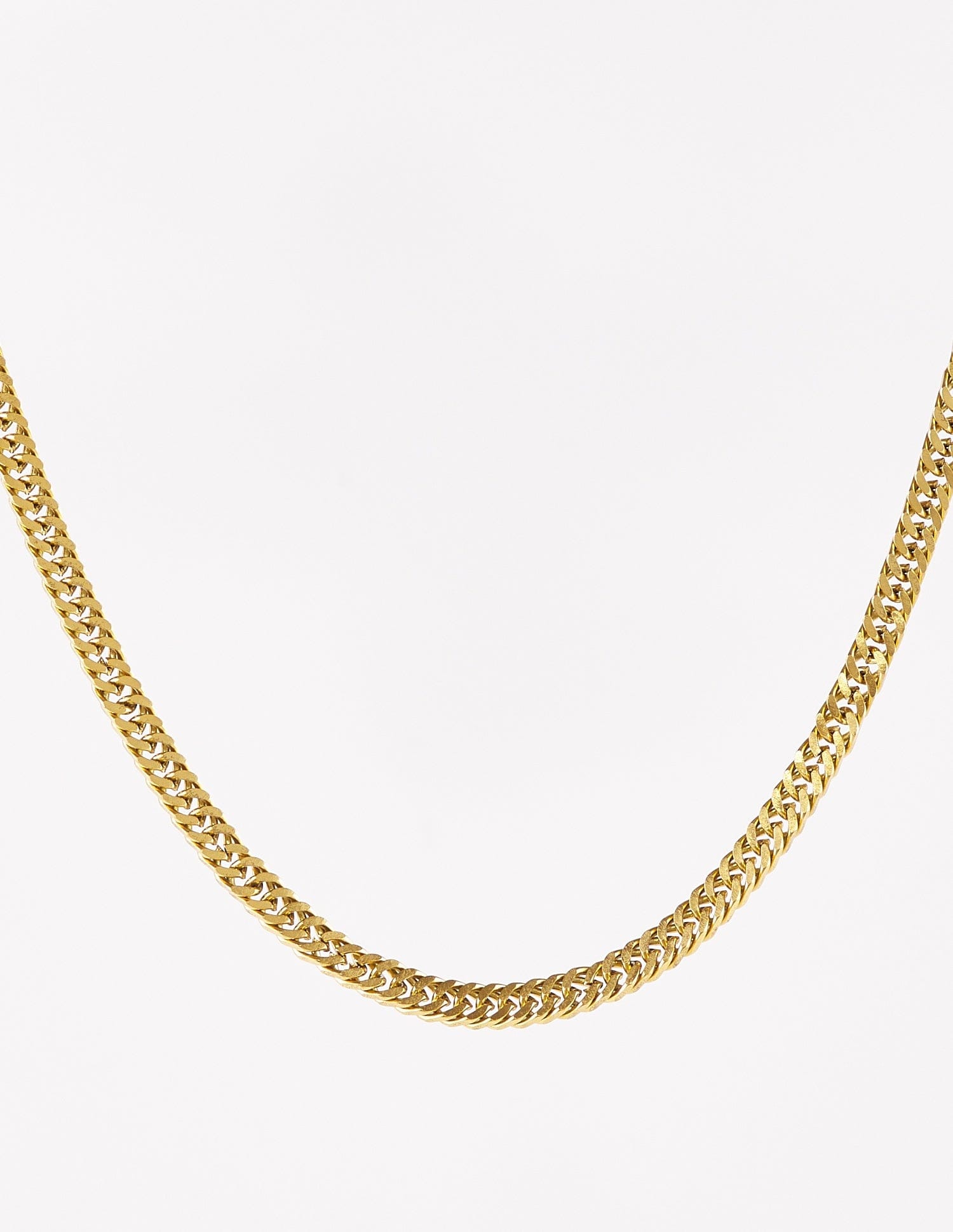 El collar con eslabones dorado Amaia es una cadena de eslabones gruesos y bastante parecido al collar Iris, a diferencia que este collar es algo más larguito e ideal para llevarlo y combinarlo como segunda altura.