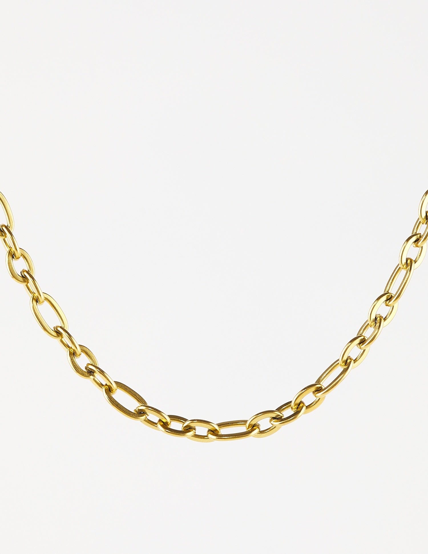 El material de este collar de eslabones es de acero color oro, es totalmente resistente al agua, y es perfecto para no quitártelo para nada.
