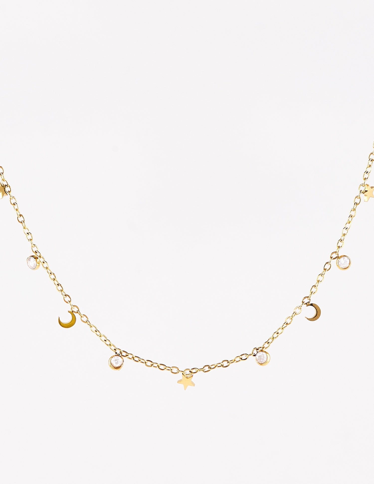 El collar con estrellas y lunas Aroa es una gargantilla con mucha energía. Está formada por estrellas, lunas y circonitas de acero inoxidable, por eso es un collar que se puede mojar. Este collar Aroa es sencillo pero súper original, tienes infinitas combinaciones para agregarle. También está disponible la versión sin circonitas, para aquellas que no les hace mucho el brilli.brilli pero sí las lunas y estrellas, se llama Nina.
