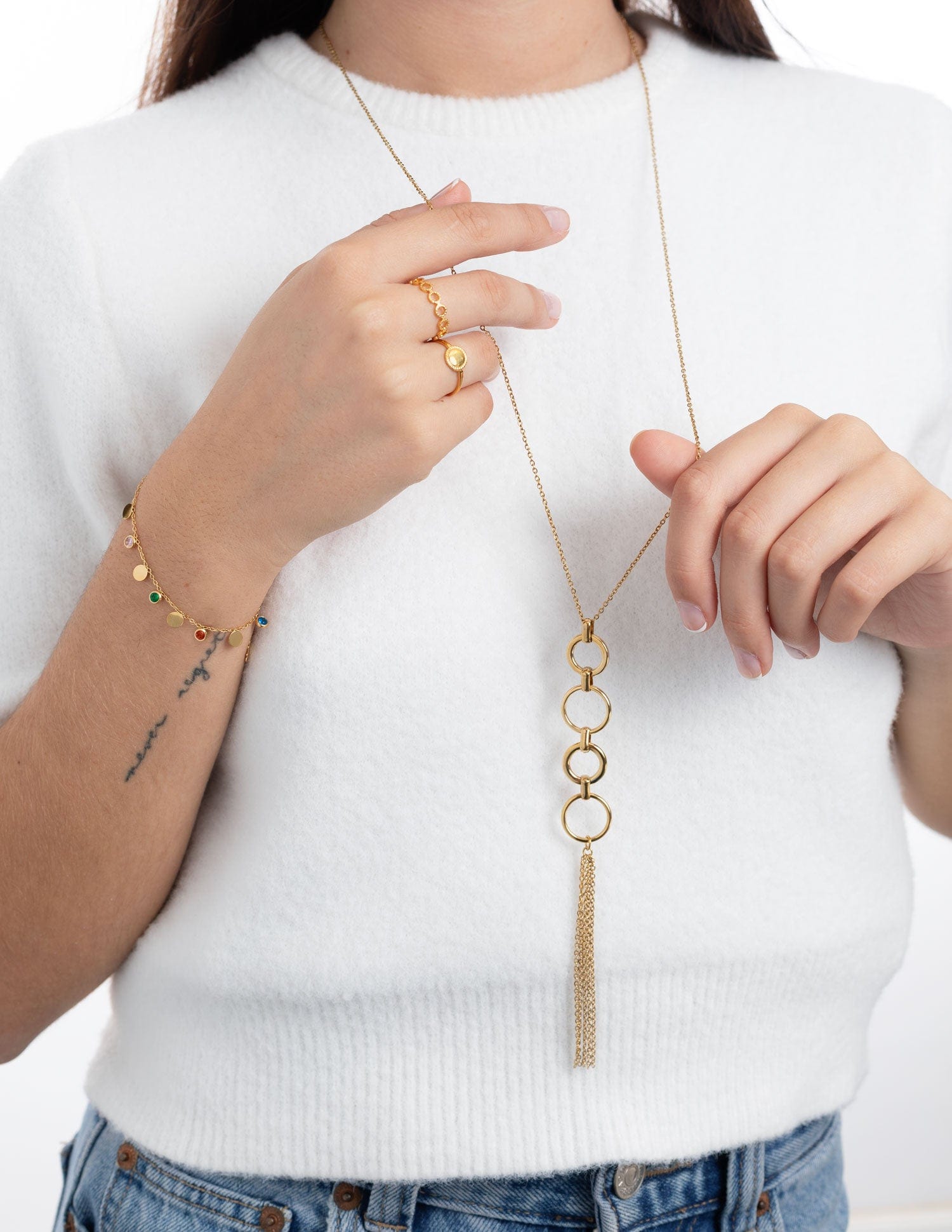 El collar Romola es espectacular. Super largo y singular. Consta de 4 círculos que puedes darle el significado que quieras, La combinación con los anillos Fabrizia y Dianora queda brutal.