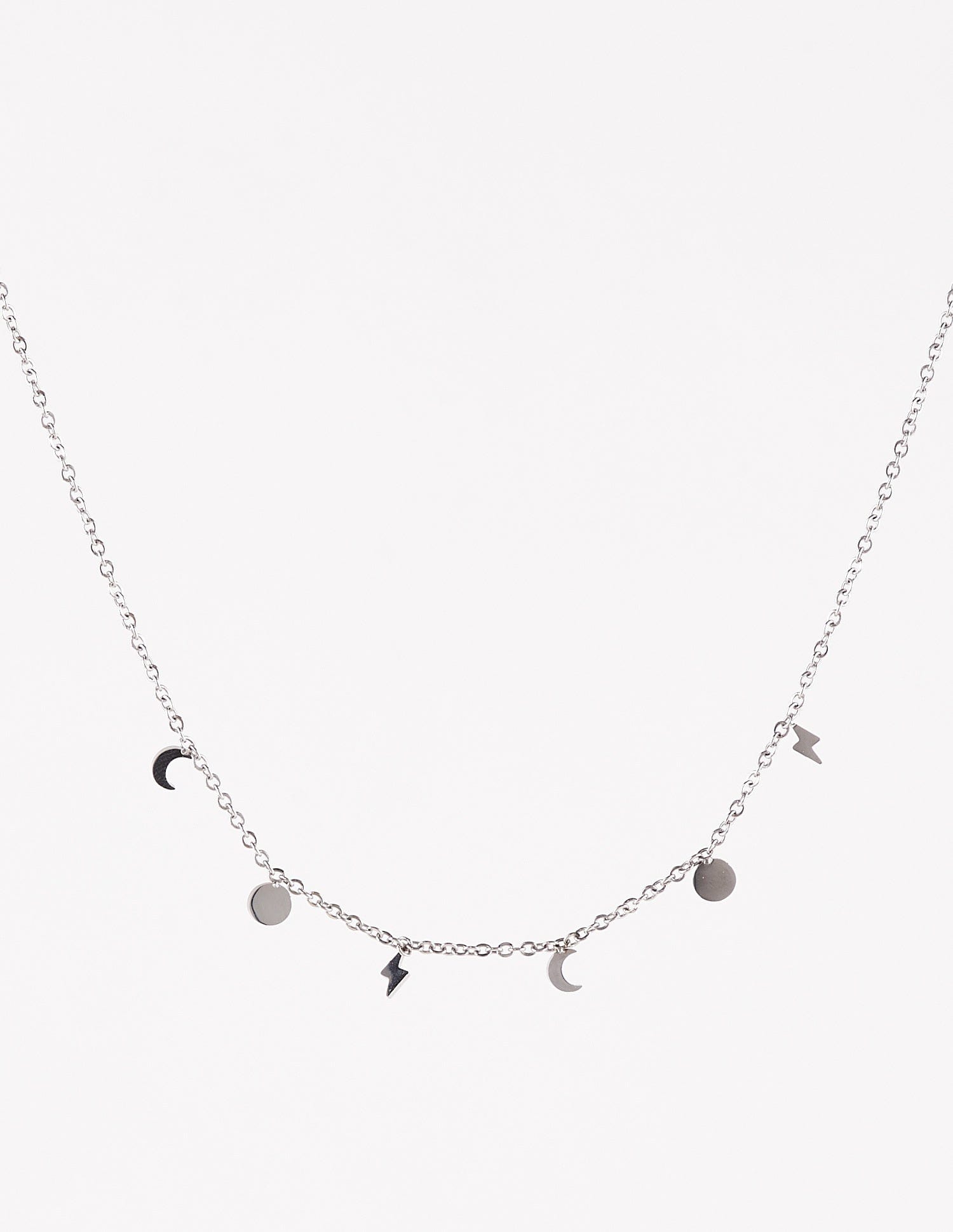 El collar Ava tiene dos rayos, dos lunas y dos medallitas, compuesta por acero con lo cuál es una gargantilla waterproof, se te hará súper fácil combinarlo con más collares, te damos una idea en una de las fotos. Consígue este collar con tanta personalidad para ti o para regalar. Disponible también en dorado, Estel.