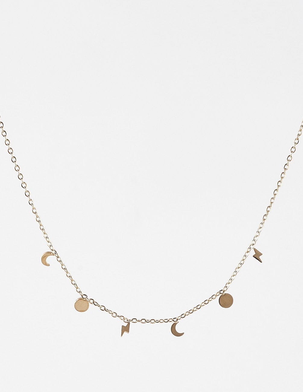 El collar Estel tiene dos rayos, dos lunas y dos medallitas, compuesta por acero con lo cuál es una gargantilla waterproof, se te hará súper fácil combinarlo con más collares, te damos una idea en una de las fotos. Consígue este collar con tanta personalidad para ti o para regalar. Disponible también en plateado, Ava.