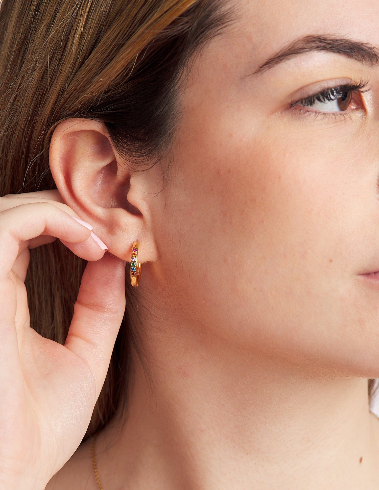 Este modelo de aro con circonitas de colores, son muy elegantes y finos, puedes combinarlos con su versión más pequeña , los Abir S. Este diseño de pendiente aporta mucha luz y contrastan súper bien con el color dorado. Puedes llevarlos siempre, no te los quites para nada, también son resistentes ala gua como todos los pendientes de nuestra colección .