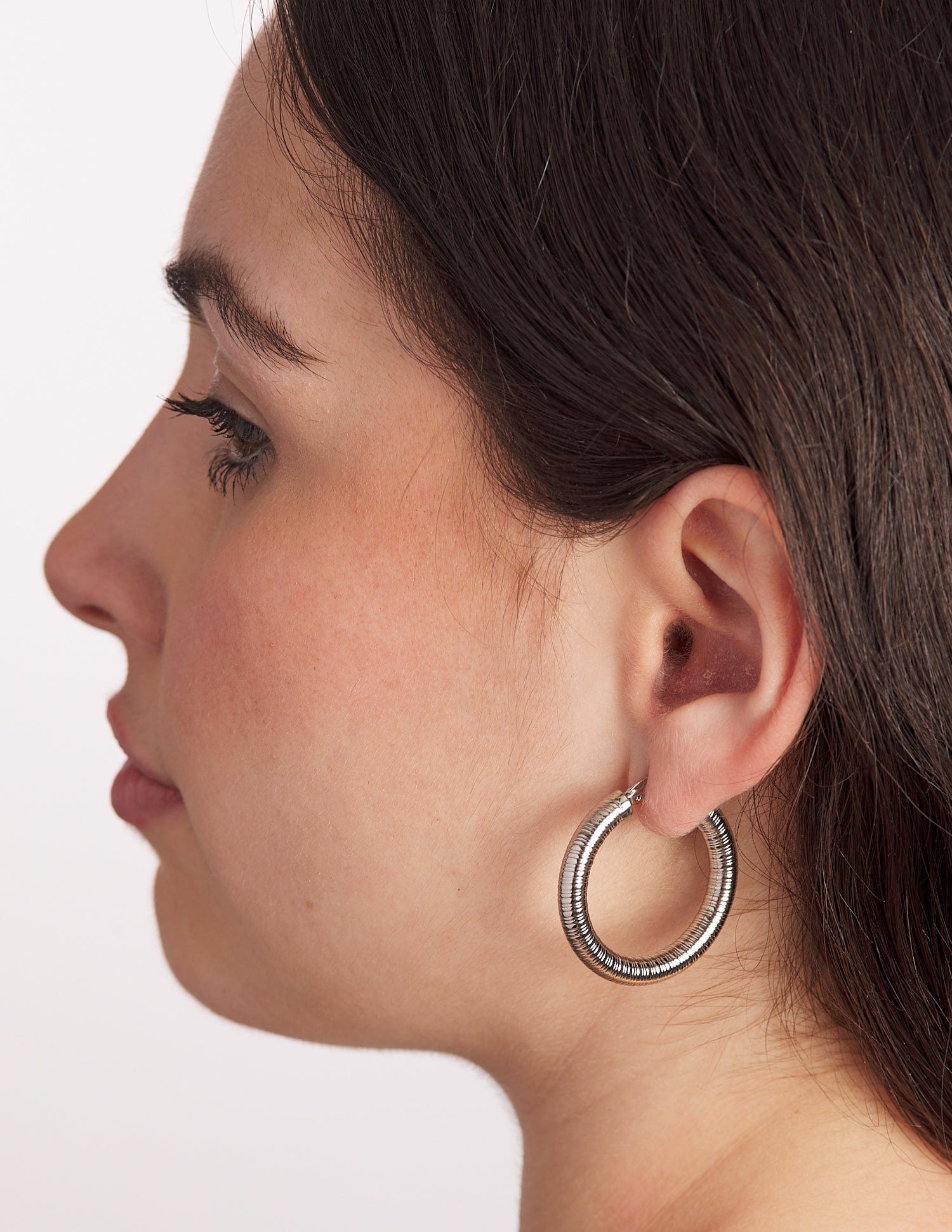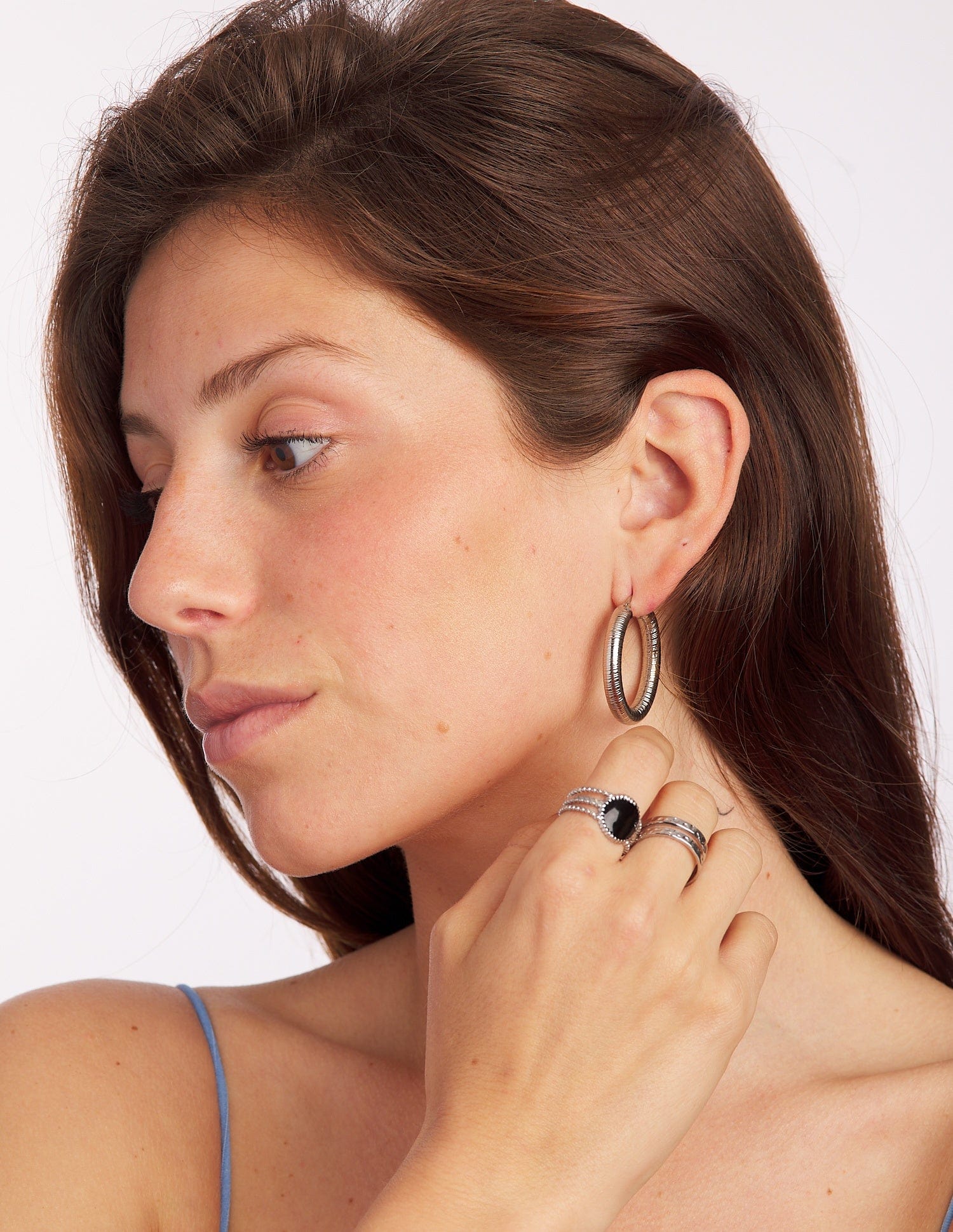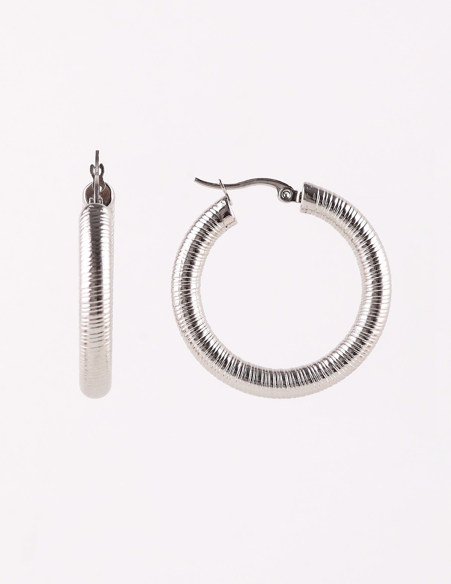 Nuestros aros Angy de acero y resistentes al agua, (35cm) tienen un diseño precioso, podemos ver que son sutilmente rayados y gruesos, (5mm) su cierre es súper seguro y no pesan! Combínalos con los aros que más te gusten de nuestra colección, ya que los Angy son tan versátiles que no te costará encontrar su compañero. Ya tienes pensado tu look?, disponibles también en dorado, Sole.