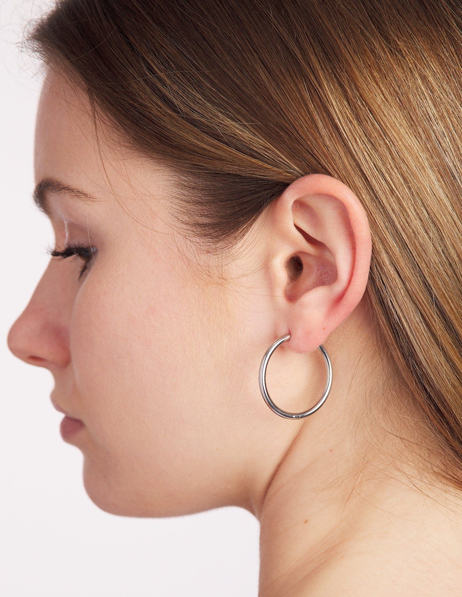 Los pendientes de aro Isabel destacan por su sencillez y versatilidad a la hora de combinarlos, su cierre de click hará que sean súper fáciles de poner y quitar, el material con el que están hechos estos pendientes Isabel es de acero color plata, no te podrán faltar en tu joyero!