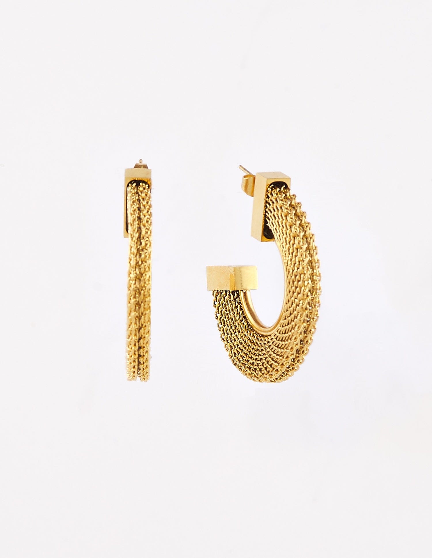Nuestros exclusivos aros Suri de acero, tienen un diseño único que te van a preguntar más de una de dónde son!, este modelo de medio aro es súper elegante y lucen por sí solos, en la foto te enseñamos las joyitas que más nos gustan para combinarlos. Son llamativos, ideales para ese look que ya estás pensando .