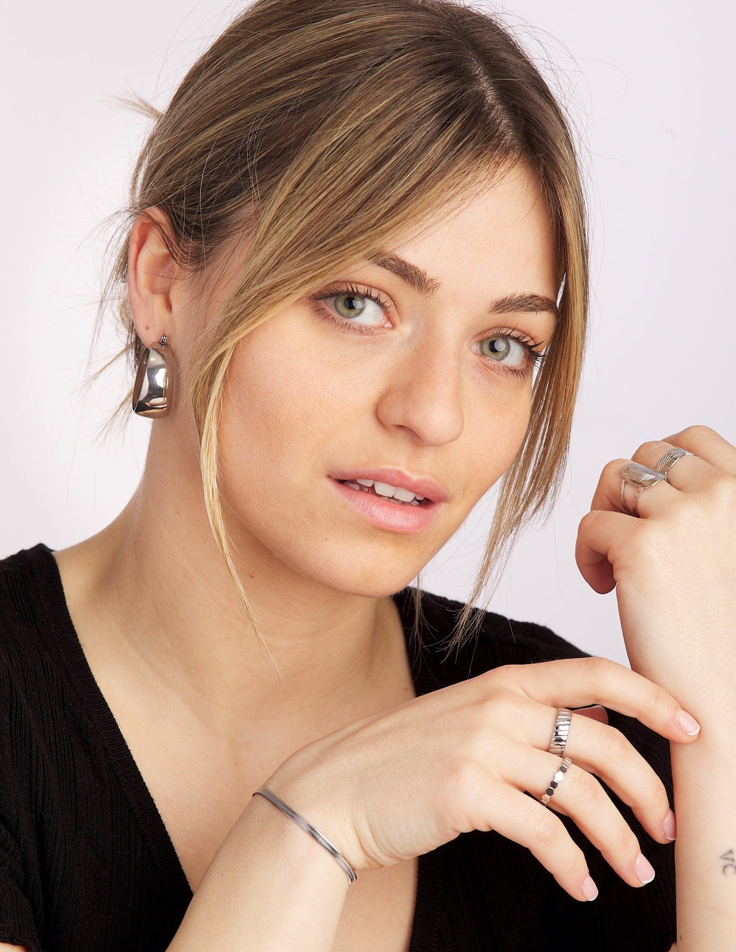 Los pendientes Nereida S, son uno de los que más os gustan!, su diseño de aro anchito, livianos y su cierre tipo catalán hacen que sean de lo más versátiles y originales para combinarlos con todos tus looks ya que son unos aros de acero color plata que los denominamos muy atemporales, quedan bien siempre!