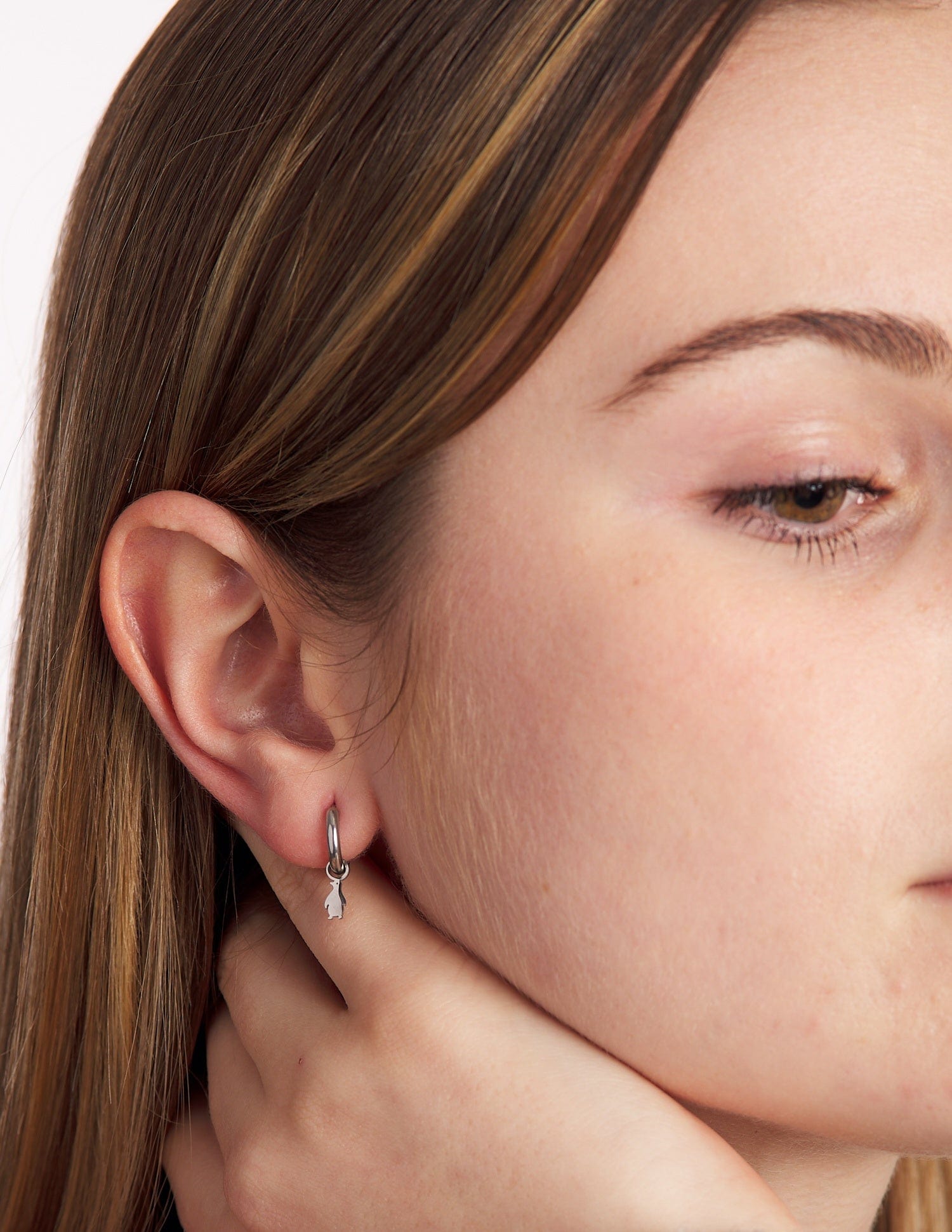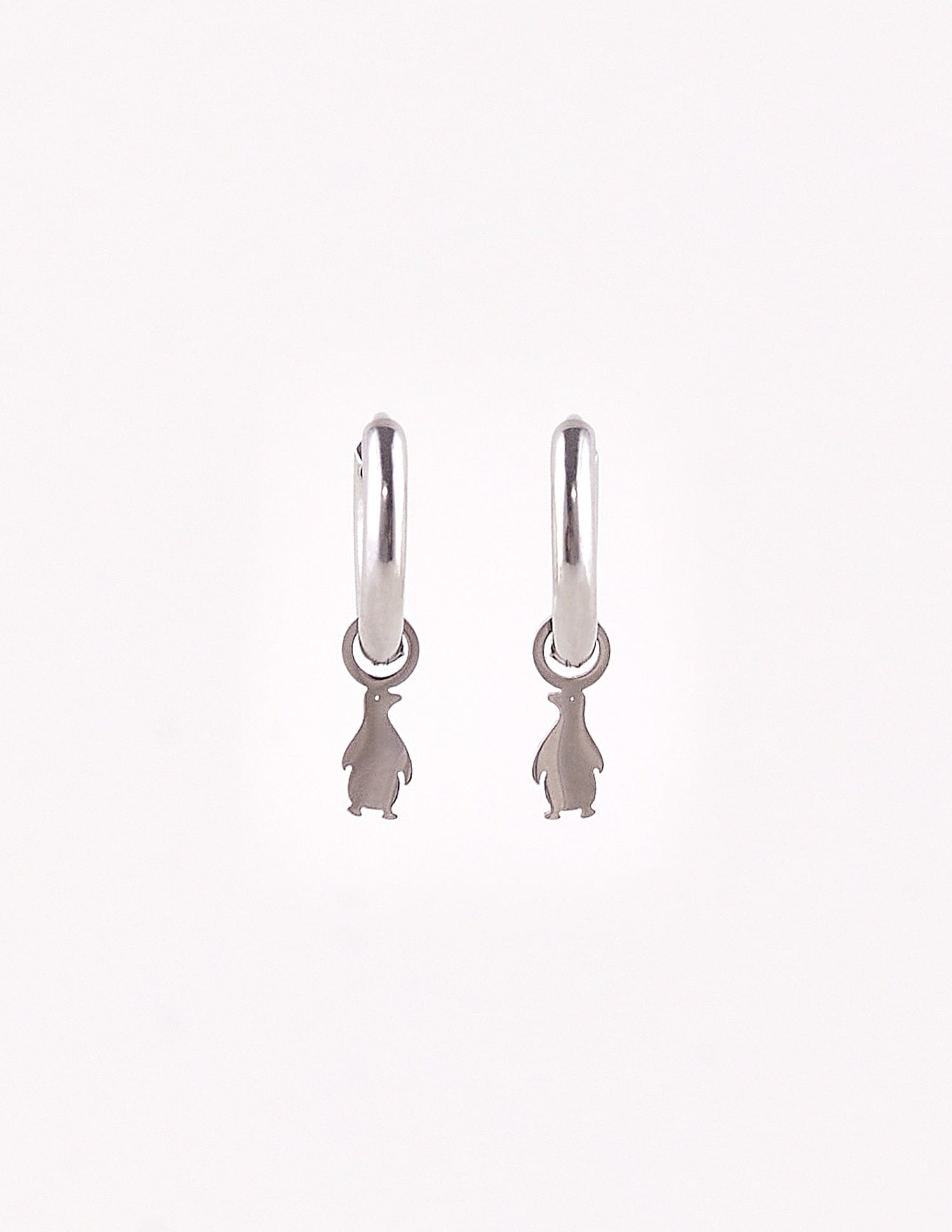Los pendientes Rita son de acero color plata y su arito tiene el cierre de click, con lo cuál son súper fáciles de quitar y poner. Lo que te encantará es que cuando quieras podrás quitarle el charm del pingüino y llevar los aritos lisos simples.
