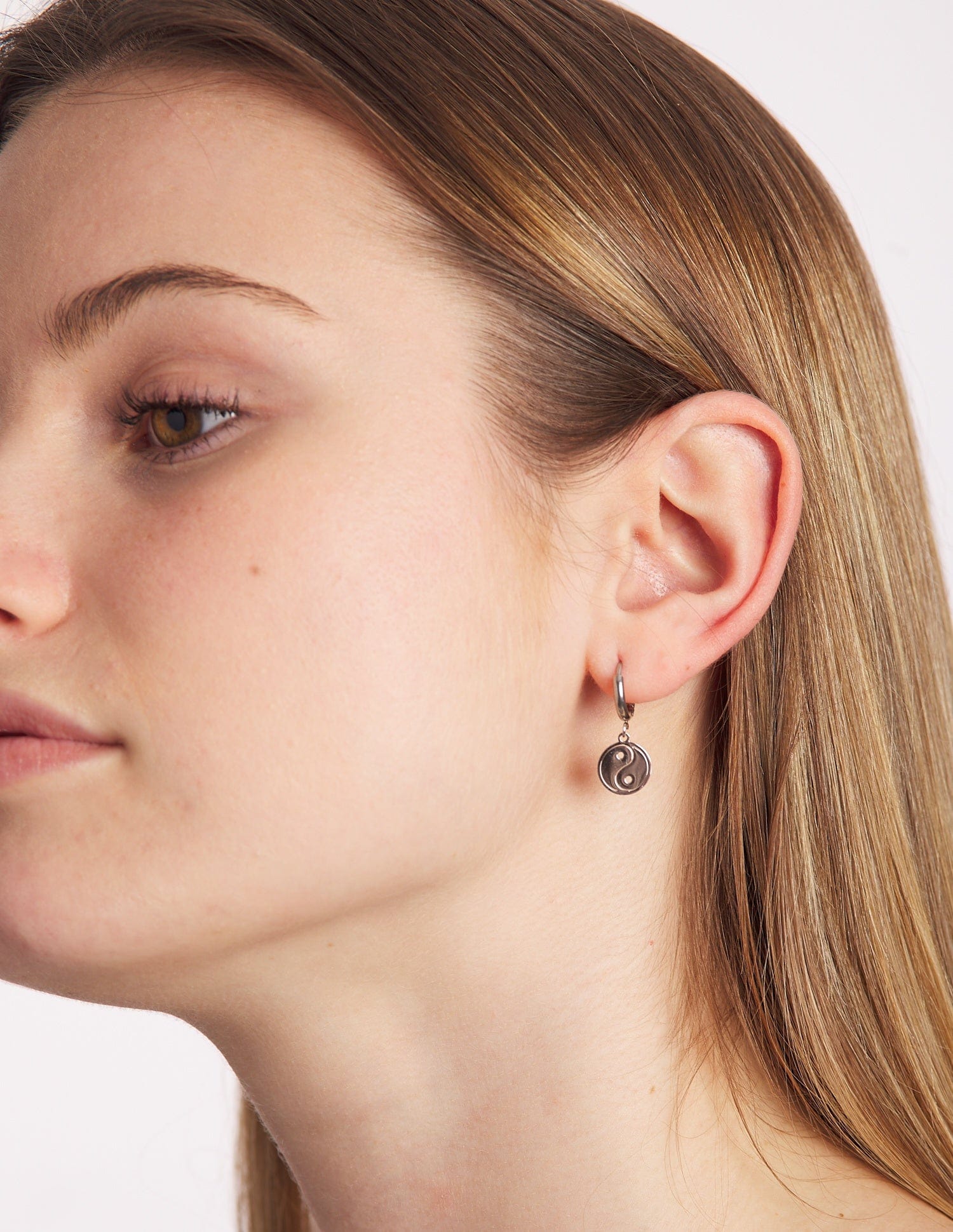 Los pendientes Elia son un dos en uno, por lo que cuando quieras podrás quitarle el charm del ying-yang y llevar los aritos lisos simples con su cierre de click.