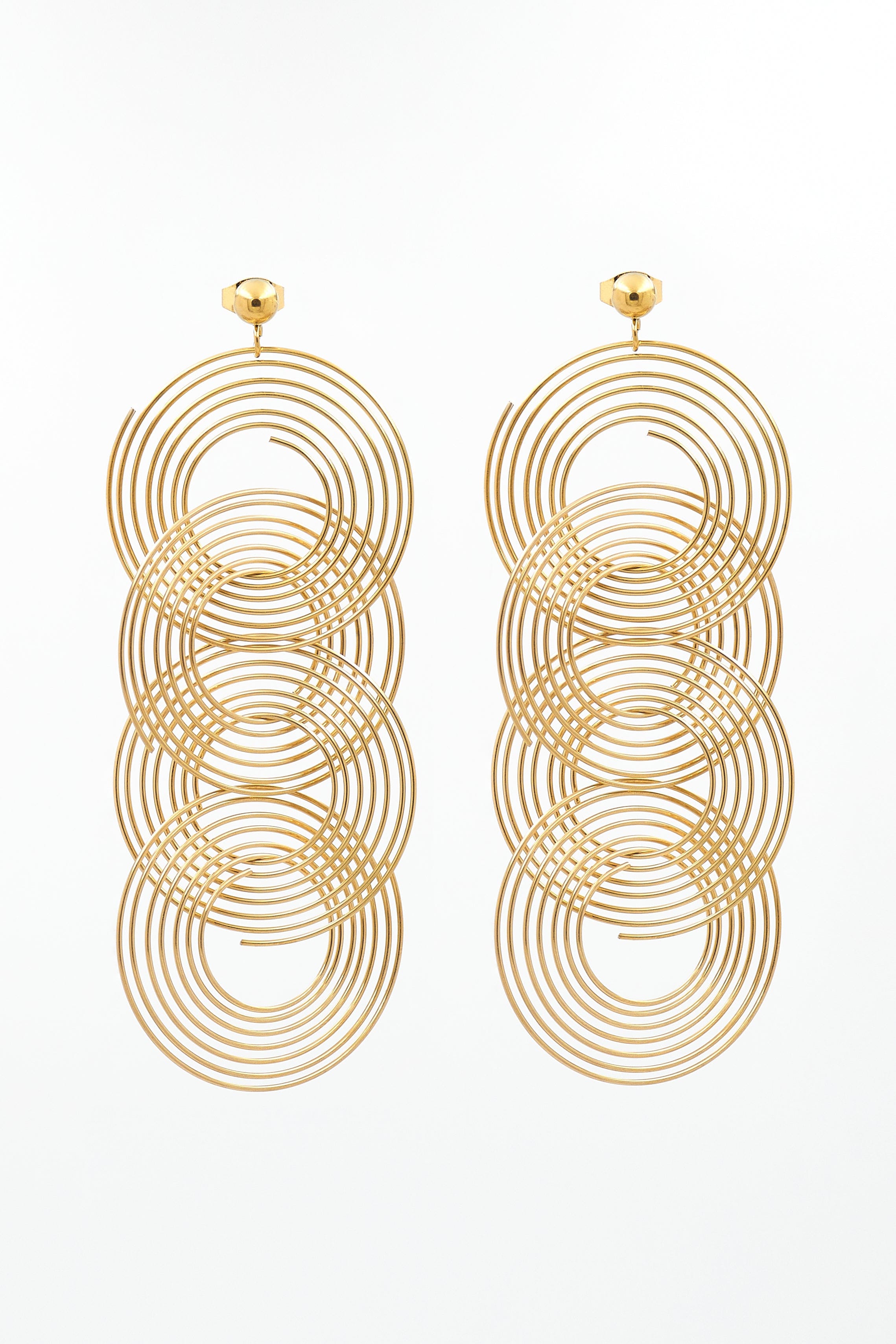 Los pendientes Justine te van a enamorar, puestos véis cómo quedan, no te vas a poder resistir con su forma peculiar de cuatro aros espirales y su cierre de bolita de acero dorada que le dá un acabado precioso.