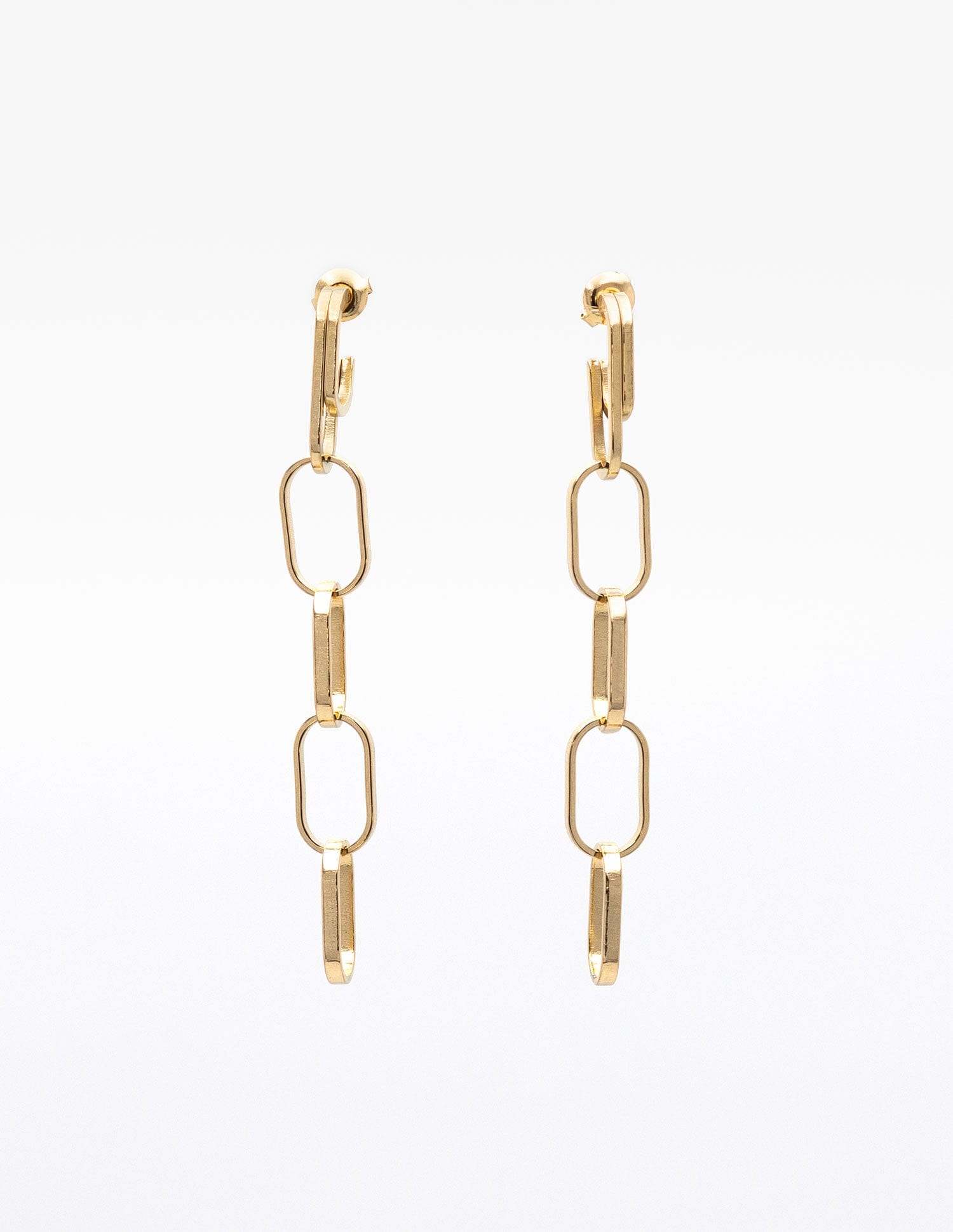 DESCRIPCIÓN: Los pendientes largos Abby, están formados por eslabones entrelazados entre sí, son versátiles y por su formología estilizan al rostro , son de acero waterproof, y estamos seguras que los lucirás con tu mejor look!