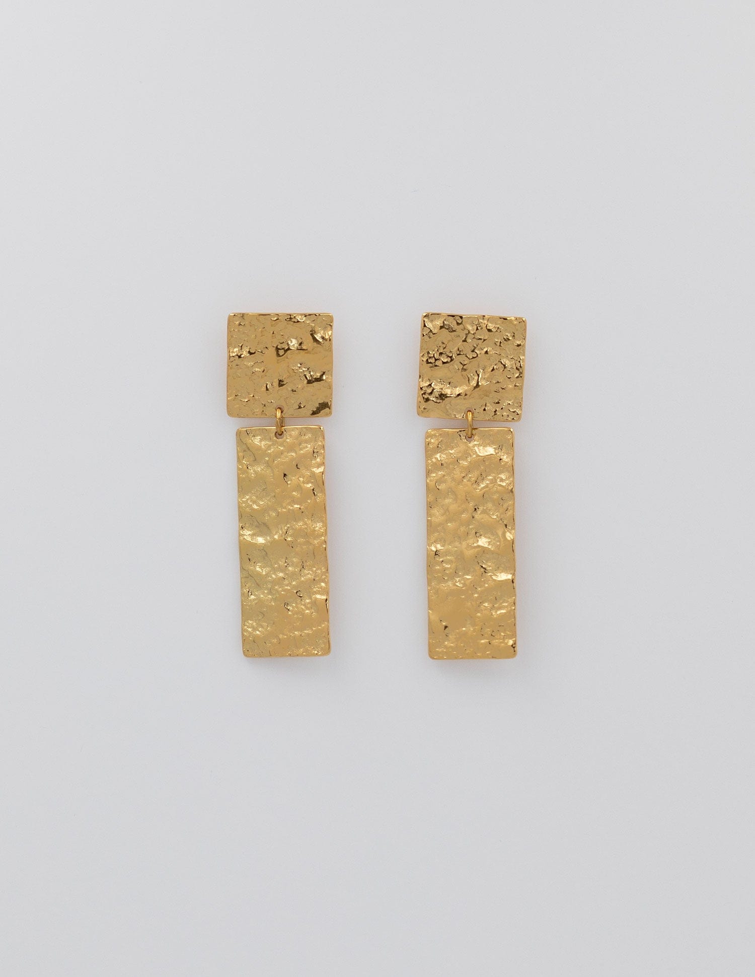 Pendientes dorados rectangulares de acero, con textura maréele, que transmiten fuerza y estilo. Unos pendientes ideales para el día a día o con looks más de arreglar. Estos pendientes son un complemento moderno y sofisticado.
