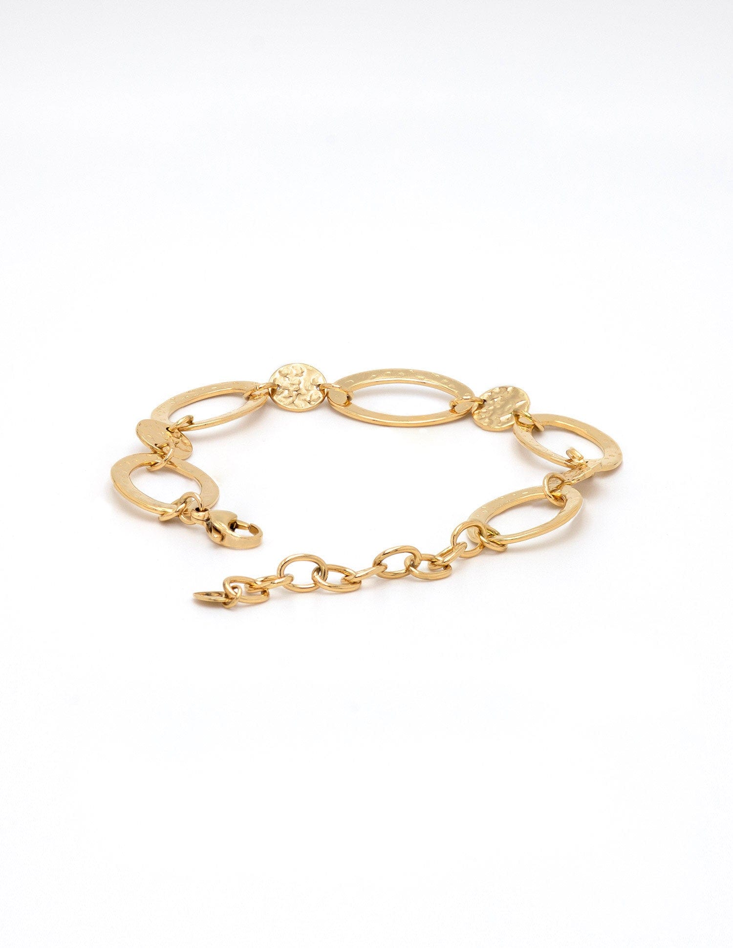 La pulsera Piera consta de óvalos abiertos combinados con medallas más pequeñas, es de acero waterproof, tiene un tamaño que puedes llevarla siempre, bien llevarla en ocasiones especiales.