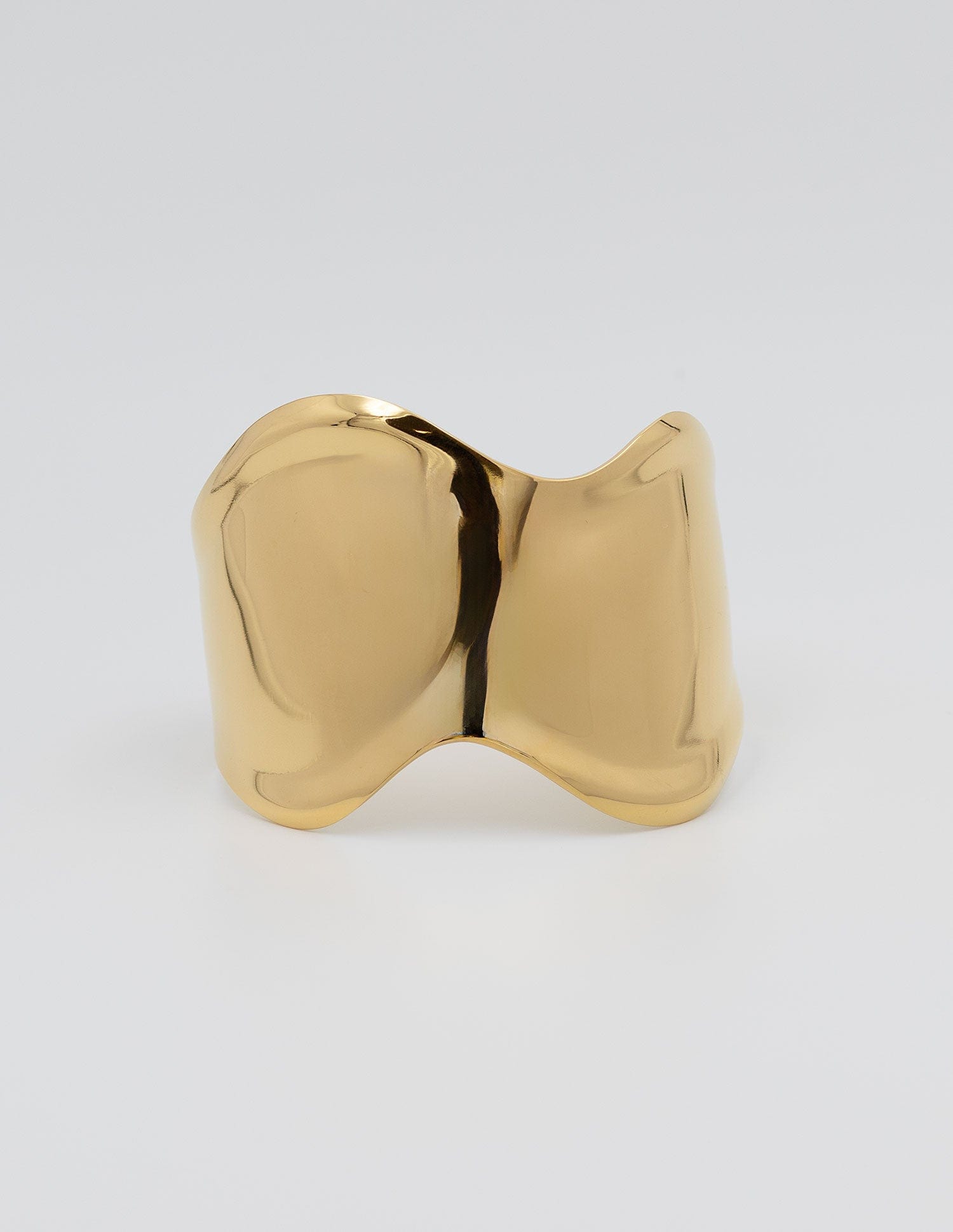 Brazalete ondulado liso con un diseño fluido y minimalista, esta esclava rígida refleja luz con cada movimiento gracias a su acabado espejo y dorado brillante. Sofisticado y versátil para cualquier estilo. Hablarán de tu pulsera ondulada si vas de evento, boda, invitada. Se ajusta perfectamente a la muñeca o antebrazo.
