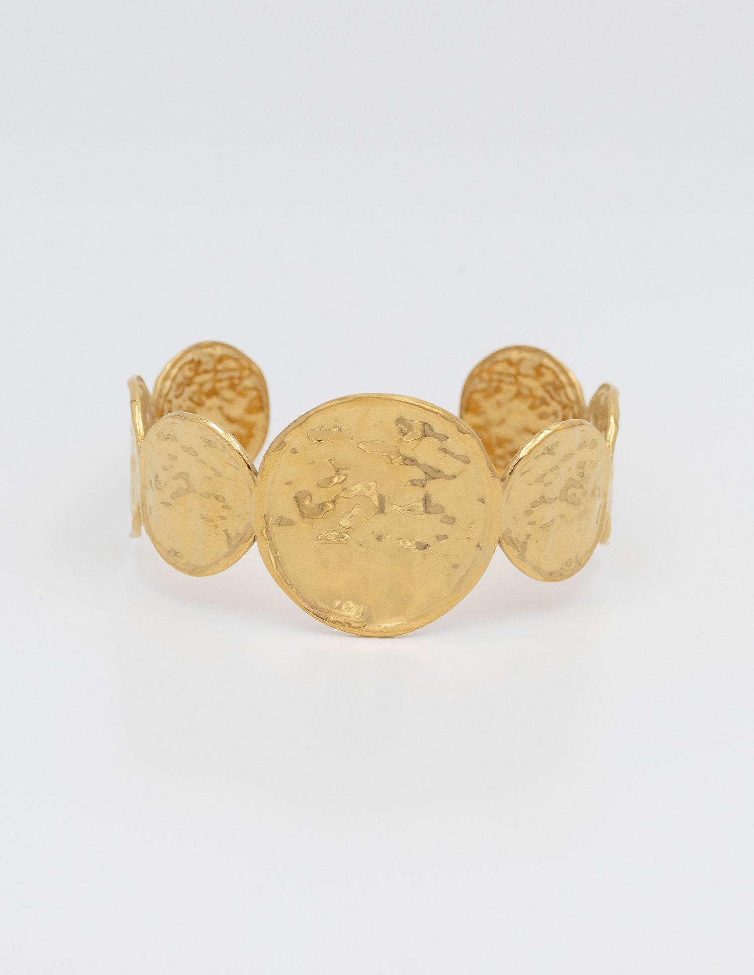 Pulsera rígida de acero inoxidable con círculos grandes , aunque la del centro es más grande. Diseño llamativo con medallas grandes con acabado irregular, rugoso. Una pulsera rígida de impacto que se convierte en el centro de cualquier look.