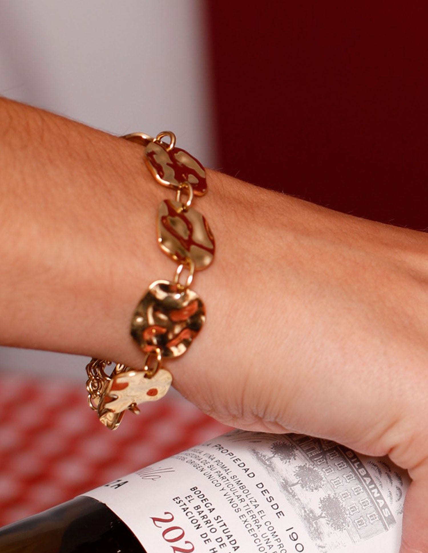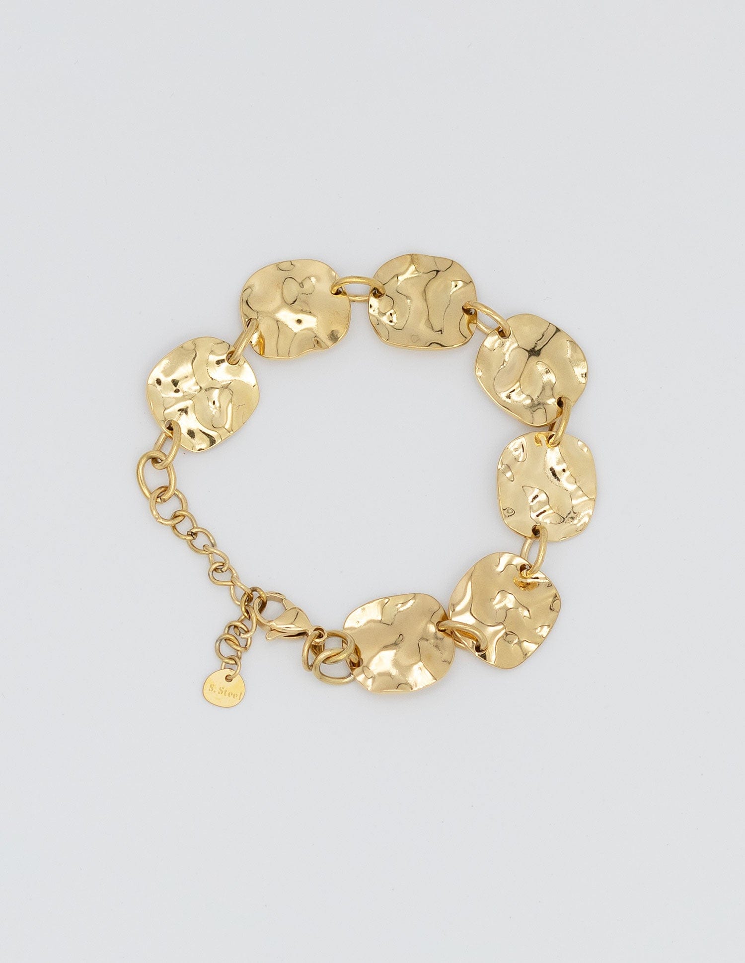 Pulsera de acero inoxidable, formada por medallas cuadradas con textura rugosa. Un diseño único que mezcla formas orgánicas. Una pulsera con estilo artístico y elegante a la vez, cómoda waterproof.