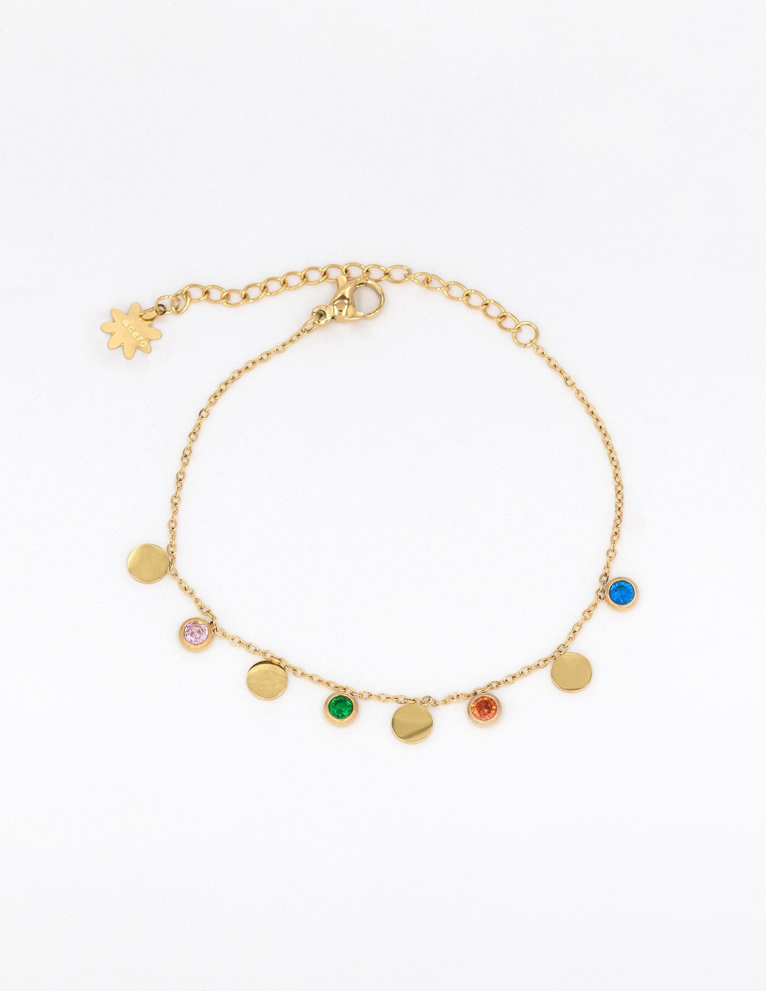 DESCRIPCIÓN: La pulsera fina Maura, consta de medallas y circonitas de colores que cuelgan sutilmente de una cadena fina de acero waterproof, ideal para regalar , no fallarás!
