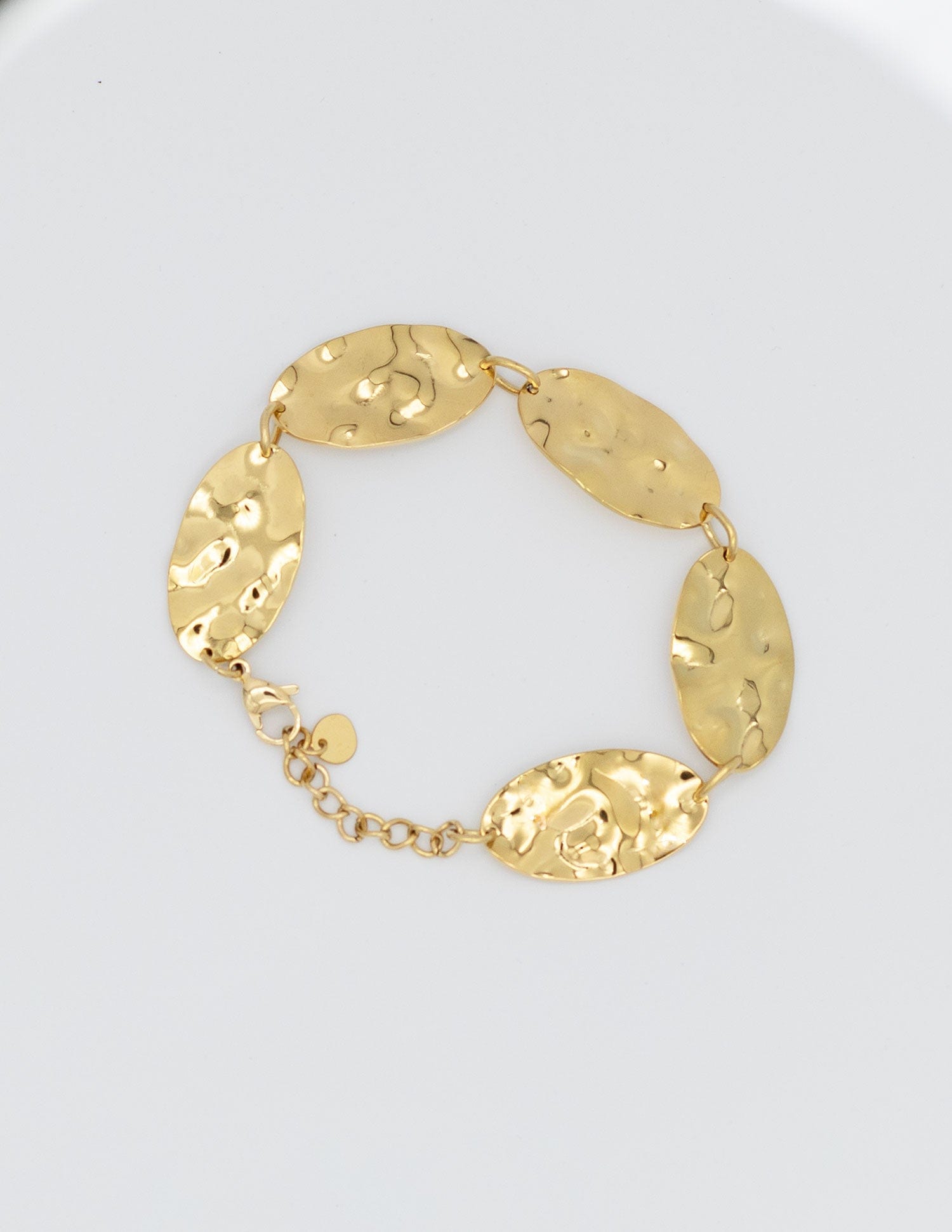 Pulsera de acero inoxidable, formada por medallas ovaladas con textura rugosa. Un diseño único que mezcla formas orgánicas. Una pulsera con estilo artístico y elegante a la vez, cómoda waterproof.